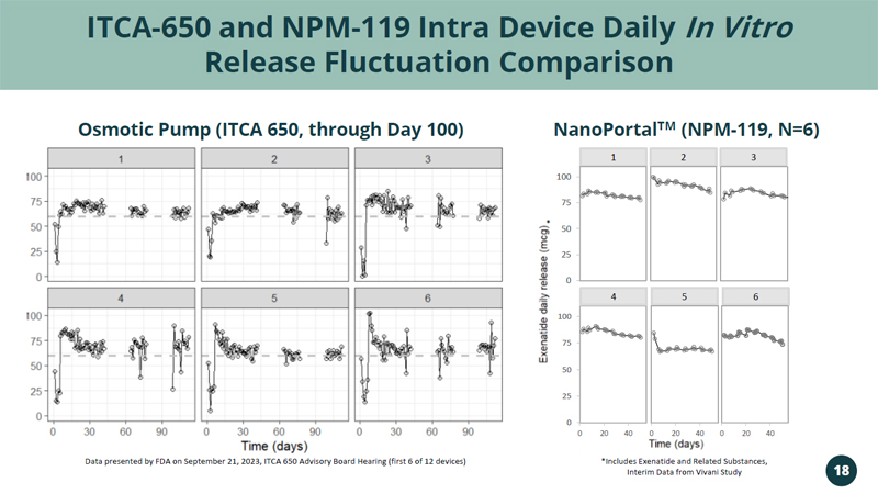 ITCA - 650 and NPM - 119 Intra Device Daily In Vitro Release Fluctuation Comparison Data presented by FDA on September 21, 2023, ITCA 650 Advisory Board Hearing (first 6 of 12 devices) NanoPortal TM (NPM - 119, N=6) Osmotic Pump (ITCA 650, through Day 100) 0 25 50 75 100 0 20 40 5 0 20 40 4 3 1 6 2 0 20 40 * 0 25 50 75 100 *Includes Exenatide and Related Substances, Interim Data from Vivani Study 18