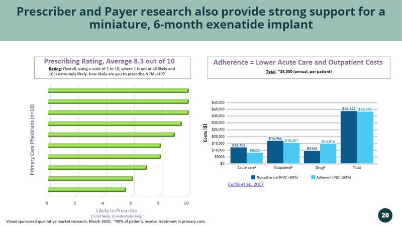 0 2 4 6 8 10 Likely to Prescribe (1=not likely, 10=extremely likely) Primary Care Physicians (n=10) Prescribing Rating, Average 8.3 out of 10 Prescriber and Payer research also provide strong support for a miniature, 6 - month exenatide implant Rating : Overall, using a scale of 1 to 10, where 1 is not at all likely and 10 is extremely likely, how likely are you to prescribe NPM - 119? Vivani sponsored qualitative market research, March 2020. ~90% of patients receive treatment in primary care. Total : ~$5,500 (annual, per patient) Adherence = Lower Acute Care and Outpatient Costs Curtis et al., 2017 20