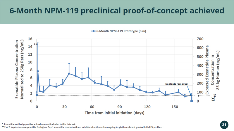 0 100 200 300 400 500 600 700 0 2 4 6 8 10 12 14 16 0 30 60 90 120 150 Expected Exenatide Plasma Concentration in 85 kg Human ( pg /mL) Exenatide Plasma Concentration Normalized to 250g Rats (ng/mL) Time from initial initiation (days) 6-Month NPM-119 Prototype (n=6) 6 - Month NPM - 119 preclinical proof - of - concept achieved EC 50 * Exenatide antibody - positive animals are not included in this data set. **2 of 6 implants are responsible for higher Day 1 exenatide concentrations. Additional optimization ongoing to yield consis ten t gradual initial PK profiles. Implants removed. ** 21