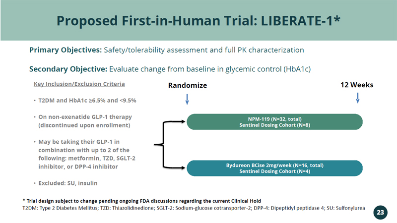 Proposed First - in - Human Trial: LIBERATE - 1* Primary Objectives: Safety/tolerability assessment and full PK characterization Secondary Objective: Evaluate change from baseline in glycemic control (HbA1c) Randomize 12 Weeks Key Inclusion/Exclusion Criteria • T2DM and HbA1c ≥6.5% and <9.5% • On non - exenatide GLP - 1 therapy (discontinued upon enrollment) • May be taking their GLP - 1 in combination with up to 2 of the following: metformin, TZD, SGLT - 2 inhibitor, or DPP - 4 inhibitor • Excluded: SU, insulin NPM - 119 (N=32, total) Sentinel Dosing Cohort (N=8) Bydureon BCise 2mg/week (N=16, total) Sentinel Dosing Cohort (N=4) * Trial design subject to change pending ongoing FDA discussions regarding the current Clinical Hold T2DM: Type 2 Diabetes Mellitus; TZD: Thiazolidinedione; SGLT - 2: Sodium - glucose cotransporter - 2; DPP - 4: Dipeptidyl peptidase 4; S U: Sulfonylurea 23