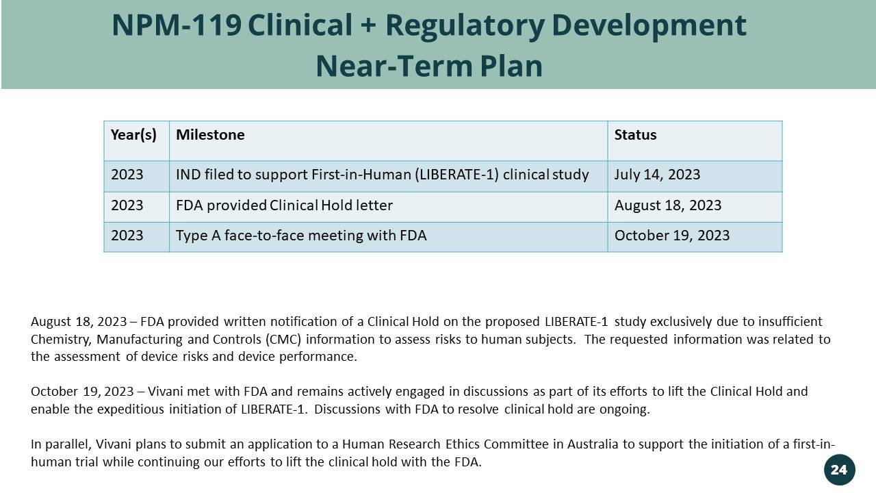 NPM - 119 Clinical + Regulatory Development Near - Term Plan Year(s) Milestone Status 2023 IND filed to support First - in - Human (LIBERATE - 1) clinical study July 14, 2023 2023 FDA provided Clinical Hold letter August 18, 2023 2023 Type A face - to - face meeting with FDA October 19, 2023 August 18, 2023 – FDA provided written notification of a Clinical Hold on the proposed LIBERATE - 1 study primarily due to insuffi cient Chemistry, Manufacturing and Controls (CMC) information to assess risks to human subjects. The requested information was rel ate d to the assessment of device risks and device performance. October 19, 2023 – Vivani met with FDA and remains actively engaged in discussions as part of its efforts to lift the Clinical Hold and enable the expeditious initiation of LIBERATE - 1. Discussions with FDA to resolve clinical hold are ongoing. In parallel, Vivani plans to submit an application to a Human Research Ethics Committee in Australia to support the initiatio n o f a first - in - human trial while continuing our efforts to lift the clinical hold with the FDA. 24