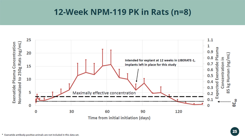 0 0.1 0.2 0.3 0.4 0.5 0.6 0.7 0.8 0.9 1 1.1 0 5 10 15 20 25 0 30 60 90 120 Expected Exenatide Plasma Concentration in 85 kg Human (ng/mL) Exenatide Plasma Concentration Normalized to 250g Rats (ng/mL) Time from initial initiation (days) 12 - Week NPM - 119 PK in Rats (n=8) * Exenatide antibody - positive animals are not included in this data set. 25 EC 50 Maximally effective concentration Intended for explant at 12 weeks in LIBERATE - 1, implants left in place for this study