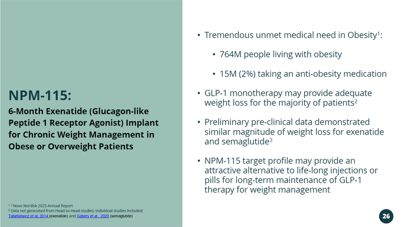 • Tremendous unmet medical need in Obesity 1 : • 764M people living with obesity • 15M (2%) taking an anti - obesity medication • GLP - 1 monotherapy may provide adequate weight loss for the majority of patients 2 • Preliminary pre - clinical data demonstrated similar magnitude of weight loss for exenatide and semaglutide 3 • NPM - 115 target profile may provide an attractive alternative to life - long injections or pills for long - term maintenance of GLP - 1 therapy for weight management 6 - Month Exenatide (Glucagon - like Peptide 1 Receptor Agonist) Implant for Chronic Weight Management in Obese or Overweight Patients NPM - 115: 26 1, 2 Novo Nordisk 2023 Annual Report 3 Data not generated from Head - to - Head studies; Individual studies included: Tatarkiewicz et al, 2014 (exenatide) and Gabery et al., 2020 (semaglutide)