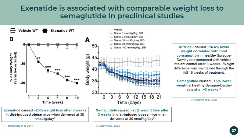 Exenatide is associated with comparable weight loss to semaglutide in preclinical studies Exenatide caused ~23% weight loss after 3 weeks in diet - induced obese mice when delivered at 30 nmol/kg/day 1 Semaglutide caused ~23% weight loss after 3 weeks in diet - induced obese mice when delivered at 30 nmol/kg/day 2 NPM - 119 caused ~16.6% lower weight correlated with food consumption in healthy Sprague - Dawley rats compared with vehicle implant control after 3 weeks. Weight difference was maintained through the full 16 weeks of treatment. Semaglutide caused ~16% lower weight in healthy Sprague - Dawley rats after ~3 weeks. 3 1. Tatarkiewicz et al, 2014 2. Gabery et al., 2020 3 . Cawthon et al., 2023 27