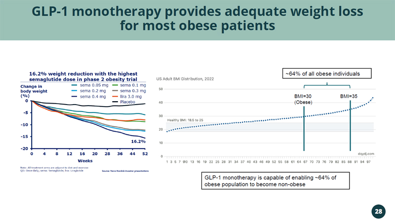 GLP - 1 monotherapy provides adequate weight loss for most obese patients GLP - 1 monotherapy is capable of enabling ~64% of obese population to become non - obese BMI=30 (Obese) BMI=35 ~64% of all obese individuals 28