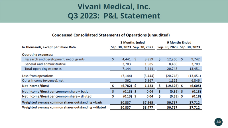 Vivani Medical, Inc. Q3 2023: P&L Statement 30 In Thousands, except per Share Data Sep. 30, 2023 Sep. 30, 2022 Sep. 30, 2023 Sep. 30, 2023 Operating expenses: Research and development, net of grants 4,441$ 3,859$ 12,260$ 9,742$ General and administrative 2,703 1,585 8,488 3,709 Total operating expenses 7,144 5,444 20,748 13,451 Loss from operations (7,144) (5,444) (20,748) (13,451) Other income (expense), net 362 6,867 1,122 6,846 Net income/(loss) (6,782)$ 1,423$ (19,626)$ (6,605)$ Net income/(loss) per common share – basic (0.13)$ 0.04$ (0.39)$ (0.18)$ Net income/(loss) per common share – diluted (0.13)$ 0.04$ (0.39)$ (0.18)$ Weighted average common shares outstanding – basic 50,837 37,965 50,757 37,712 Weighted average common shares outstanding – diluted 50,837 38,477 50,757 37,712 3 Months Ended 9 Months Ended Condensed Consolidated Statements of Operations (unaudited)