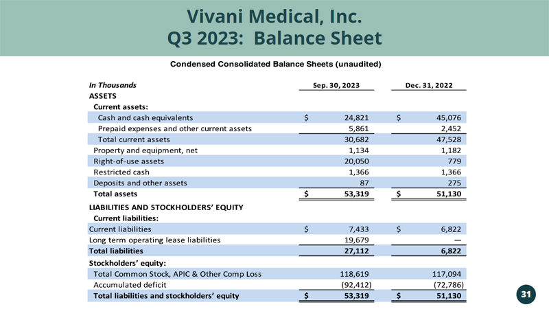 Vivani Medical, Inc. Vivani Medical, Inc. Q3 2023: Balance Sheet 31