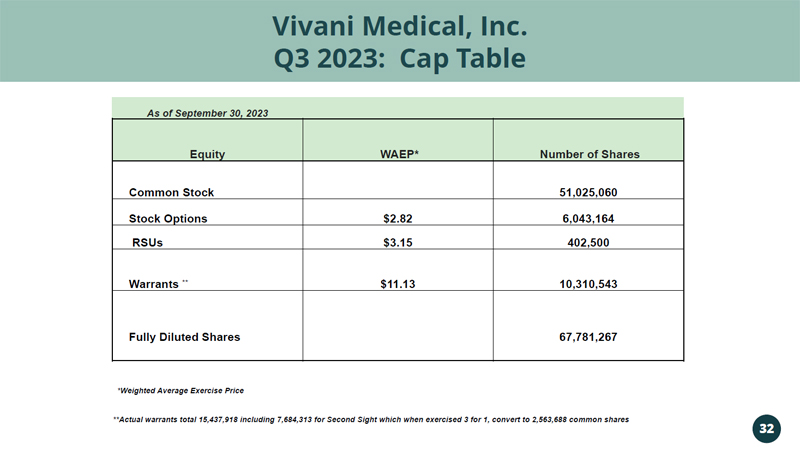 Vivani Medical, Inc. Q3 2023: Cap Table 32 As of September 30, 2023 Equity WAEP* Number of Shares Common Stock 51,025,060 Stock Options $2.82 6,043,164 RSUs $3.15 402,500 Warrants ** $11.13 10,310,543 Fully Diluted Shares 67,781,267 *Weighted Average Exercise Price **Actual warrants total 15,437,918 including 7,684,313 for Second Sight which when exercised 3 for 1, convert to 2,563,688 co mmo n shares