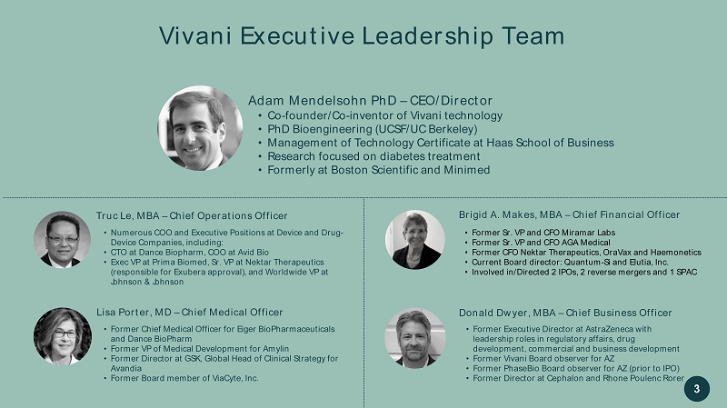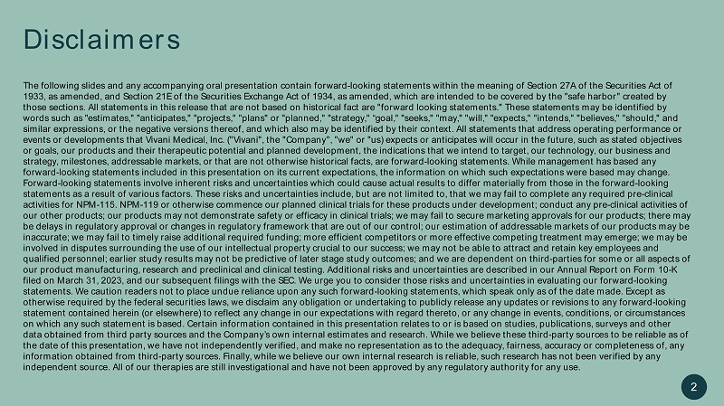 Disclaimers The following slides and any accompanying oral presentation contain forward - looking statements within the meaning of Section 27A of the Securities Act of 1933, as amended, and Section 21E of the Securities Exchange Act of 1934, as amended, which are intended to be covered by the "s afe harbor" created by those sections. All statements in this release that are not based on historical fact are "forward looking statements." These sta tements may be identified by words such as "estimates," "anticipates," "projects," "plans" or "planned," "strategy," “goal," "seeks," "may," "will," "expe cts ," "intends," "believes," "should," and similar expressions, or the negative versions thereof, and which also may be identified by their context. All statements that ad dress operating performance or events or developments that Vivani Medical, Inc. ("Vivani", the "Company", "we" or "us) expects or anticipates will occur in the future, such as stated objectives or goals, our products and their therapeutic potential and planned development, the indications that we intend to target, our te chnology, our business and strategy, milestones, addressable markets, or that are not otherwise historical facts, are forward - looking statements. While man agement has based any forward - looking statements included in this presentation on its current expectations, the information on which such expectations were based may change. Forward - looking statements involve inherent risks and uncertainties which could cause actual results to differ materially from t hose in the forward - looking statements as a result of various factors. These risks and uncertainties include, but are not limited to, that we may fail to complete any required pre - clinical activities for NPM - 115. NPM - 119 or otherwise commence our planned clinical trials for these products under development; conduct any pre - clinical activities of our other products; our products may not demonstrate safety or efficacy in clinical trials; we may fail to secure marketing a ppr ovals for our products; there may be delays in regulatory approval or changes in regulatory framework that are out of our control; our estimation of addressable markets of our products may be inaccurate; we may fail to timely raise additional required funding; more efficient competitors or more effective competing t rea tment may emerge; we may be involved in disputes surrounding the use of our intellectual property crucial to our success; we may not be able to attract a nd retain key employees and qualified personnel; earlier study results may not be predictive of later stage study outcomes; and we are dependent on third - pa rties for some or all aspects of our product manufacturing, research and preclinical and clinical testing. Additional risks and uncertainties are described in ou r Annual Report on Form 10 - K filed on March 31, 2023, and our subsequent filings with the SEC. We urge you to consider those risks and uncertainties in ev alu ating our forward - looking statements. We caution readers not to place undue reliance upon any such forward - looking statements, which speak only as of the date made. Except as otherwise required by the federal securities laws, we disclaim any obligation or undertaking to publicly release any updates or revisions to any fo rward - looking statement contained herein (or elsewhere) to reflect any change in our expectations with regard thereto, or any change in eve nts , conditions, or circumstances on which any such statement is based. Certain information contained in this presentation relates to or is based on studies, publications, surveys and other data obtained from third party sources and the Company’s own internal estimates and research. While we believe these third - party sources to be reliable as of the date of this presentation, we have not independently verified, and make no representation as to the adequacy, fairness, a ccu racy or completeness of, any information obtained from third - party sources. Finally, while we believe our own internal research is reliable, such research ha s not been verified by any independent source. All of our therapies are still investigational and have not been approved by any regulatory authority for an y use. 2