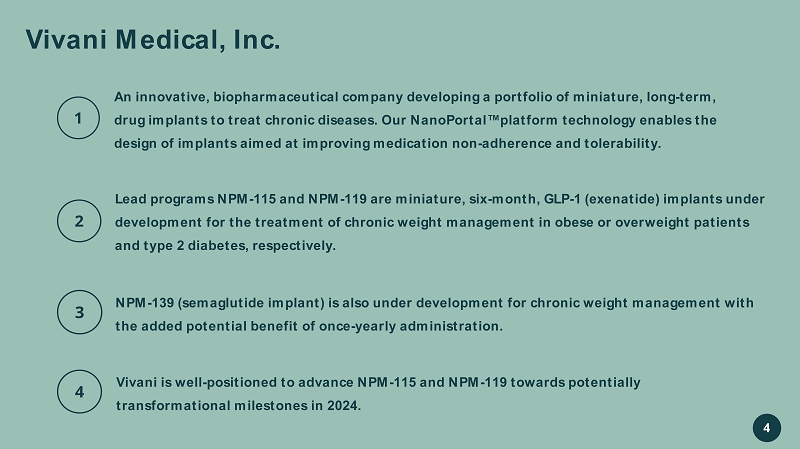 Vivani Medical, Inc. 34 Lead programs NPM - 115 and NPM - 119 are miniature, six - month, GLP - 1 (exenatide) implants under development for the treatment of chronic weight management in obese or overweight patients and type 2 diabetes, respectively. NPM - 139 (semaglutide implant) is also under development for chronic weight management with the added potential benefit of once - yearly administration. An innovative, biopharmaceutical company developing a portfolio of miniature, long - term, drug implants to treat chronic disease. Our NanoPortal ™ platform technology enables the design of implants aimed at improving medication non - adherence and tolerability. Vivani is well - positioned to advance NPM - 115 and NPM - 119 towards potentially transformational milestones in 2024.