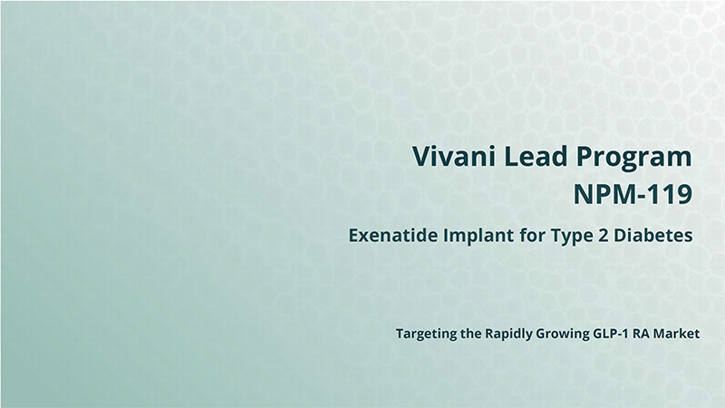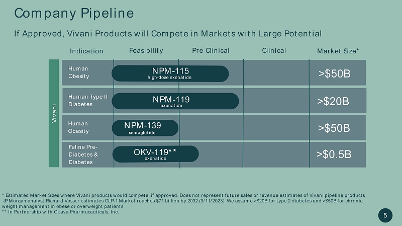 Vivani Medical, Inc. 4 Lead programs NPM - 115 and NPM - 119 are miniature, six - month, GLP - 1 (exenatide) implants under development for the treatment of chronic weight management in obese or overweight patients and type 2 diabetes, respectively. NPM - 139 (semaglutide implant) is also under development for chronic weight management with the added potential benefit of once - yearly administration. An innovative, biopharmaceutical company developing a portfolio of miniature, long - term, drug implants to treat chronic diseases. Our NanoPortal ™ platform technology enables the design of implants aimed at improving medication non - adherence and tolerability. Vivani is well - positioned to advance NPM - 115 and NPM - 119 towards potentially transformational milestones in 2024.