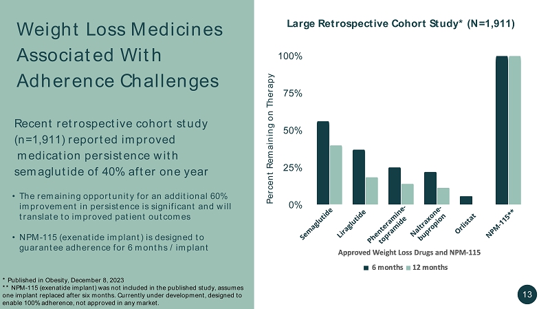 100% 75% 50% 25% 0% • The remaining opportunity for an additional 60% improvement in persistence is significant and will translate to improved patient outcomes • NPM - 115 (exenatide implant) is designed to guarantee adherence for 6 months / implant Recent retrospective cohort study (n=1,911) reported improved medication persistence with semaglutide of 40% after one year Weight Loss Medicines Associated With Adherence Challenges Large Retrospective Cohort Study* (N=1,911) 13 * Published in Obesity, December 8, 2023 ** NPM - 115 (exenatide implant) was not included in the published study, assumes one implant replaced after six months. Currently under development, designed to enable 100% adherence, not approved in any market. Percent Remaining on Therapy