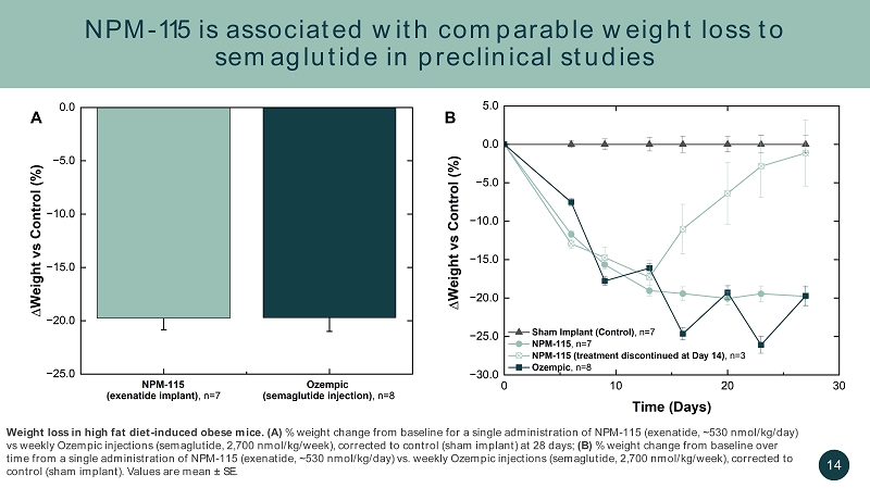 NPM - 115 is associated with comparable weight loss to semaglutide in preclinical studies 14 Weight loss in high fat diet - induced obese mice. (A) % weight change from baseline for a single administration of NPM - 115 (exenatide, ~530 nmol/kg/day) vs weekly Ozempic injections (semaglutide, 2,700 nmol/kg/week), corrected to control (sham implant) at 28 days; (B) % weight change from baseline over time from a single administration of NPM - 115 (exenatide, ~530 nmol/kg/day) vs. weekly Ozempic injections (semaglutide, 2,700 nmo l/kg/week), corrected to control (sham implant). Values are mean ± SE. A B