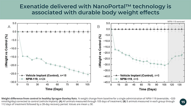 Exenatide delivered with NanoPortal™ technology is associated with durable body weight effects 15 Weight difference from control in healthy Sprague - Dawley Rats. % weight change from baseline for a single administration of NPM - 119 (exenatide, ~320 nmol/kg/day) corrected to control (vehicle implant). (A) All animals measured through 105 days of treatment; (B) 5 animals measured in each group through 112 days of treatment followed by a 28 - day recovery period. Values are mean ± SE. A B