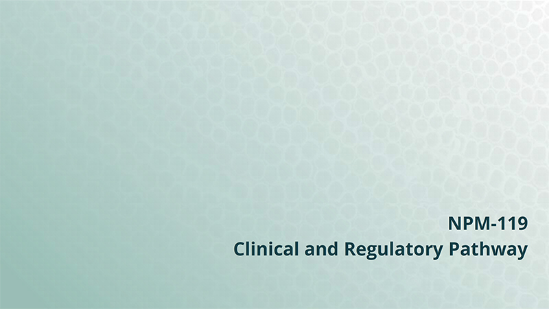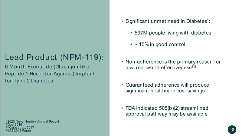 1 2023 Novo Nordisk Annual Report 2 Guo 2016 2,3 Carls et al., 2017 4 IMS 2013 Report • Significant unmet need in Diabetes 1 : • 537M people living with diabetes • ~ 15% in good control • Non - adherence is the primary reason for low, real - world effectiveness 2,3 • Guaranteed adherence will produce significant healthcare cost savings 4 • FDA indicated 505(b)(2) streamlined approval pathway may be available 6 - Month Exenatide (Glucagon - like Peptide 1 Receptor Agonist) Implant for Type 2 Diabetes Lead Product (NPM - 119): 18