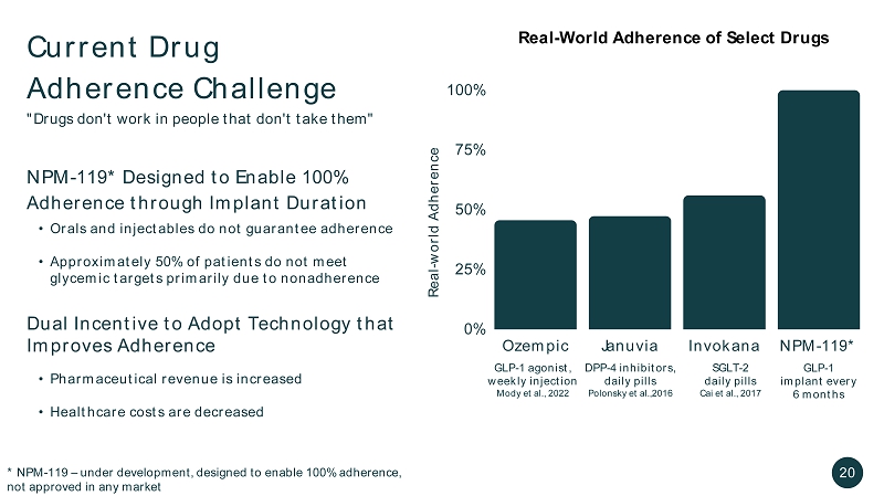 Ozempic Januvia Invokana NPM - 119* 100% 75% 50% 25% 0% GLP - 1 agonist, weekly injection Mody et al., 2022 DPP - 4 inhibitors, daily pills Polonsky et al.,2016 SGLT - 2 daily pills Cai et al., 2017 GLP - 1 implant every 6 months • Orals and injectables do not guarantee adherence • Approximately 50% of patients do not meet glycemic targets primarily due to nonadherence NPM - 119* Designed to Enable 100% Adherence through Implant Duration Dual Incentive to Adopt Technology that Improves Adherence • Pharmaceutical revenue is increased • Healthcare costs are decreased Current Drug Adherence Challenge " Drugs don't work in people that don't take them" Real - world Adherence * NPM - 119 – under development, designed to enable 100% adherence, not approved in any market Real - World Adherence of Select Drugs 20