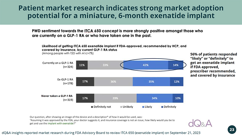 Never taken a GLP - 1 RA Patient market research indicates strong market adoption potential for a miniature, 6 - month exenatide implant dQ&A insights reported market research during FDA Advisory Board to review ITCA 650 (exenatide implant) on September 21, 2023 23 56% of patients responded “likely” or “definitely” to get an exenatide implant if FDA approved, prescriber recommended, and covered by insurance