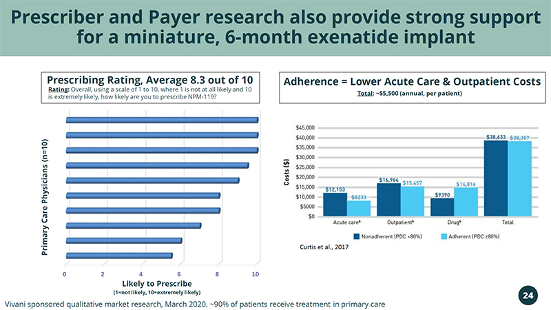 0 2 4 6 8 10 Likely to Prescribe (1=not likely, 10=extremely likely) Primary Care Physicians (n=10) Prescribing Rating, Average 8.3 out of 10 Prescriber and Payer research also provide strong support for a miniature, 6 - month exenatide implant Rating : Overall, using a scale of 1 to 10, where 1 is not at all likely and 10 is extremely likely, how likely are you to prescribe NPM - 119? Vivani sponsored qualitative market research, March 2020. ~90% of patients receive treatment in primary care Total : ~$5,500 (annual, per patient) Adherence = Lower Acute Care & Outpatient Costs Curtis et al., 2017 24