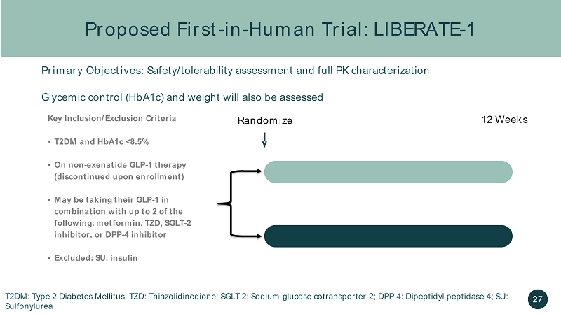 Proposed First - in - Human Trial: LIBERATE - 1 Primary Objectives: Safety/tolerability assessment and full PK characterization Glycemic control (HbA1c) and weight will also be assessed Randomize 12 Weeks Key Inclusion/Exclusion Criteria • T2DM and HbA1c <8.5% • On non - exenatide GLP - 1 therapy (discontinued upon enrollment) • May be taking their GLP - 1 in combination with up to 2 of the following: metformin, TZD, SGLT - 2 inhibitor, or DPP - 4 inhibitor • Excluded: SU, insulin T2DM: Type 2 Diabetes Mellitus; TZD: Thiazolidinedione; SGLT - 2: Sodium - glucose cotransporter - 2; DPP - 4: Dipeptidyl peptidase 4; S U: Sulfonylurea 27
