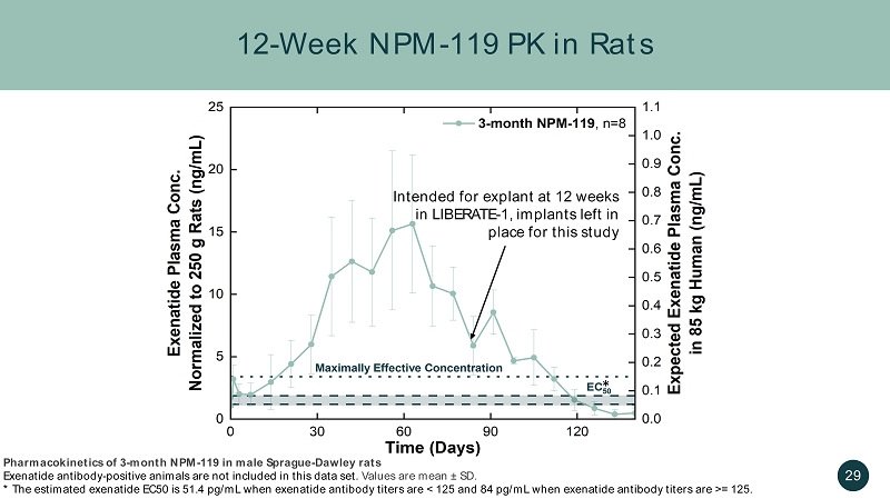 12 - Week NPM - 119 PK in Rats Intended for explant at 12 weeks in LIBERATE - 1, implants left in place for this study 29 Pharmacokinetics of 3 - month NPM - 119 in male Sprague - Dawley rats Exenatide antibody - positive animals are not included in this data set. Values are mean ± SD. * The estimated exenatide EC50 is 51.4 pg /mL when exenatide antibody titers are < 125 and 84 pg /mL when exenatide antibody titers are >= 125. *