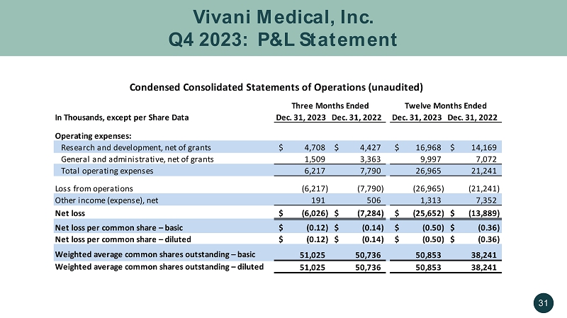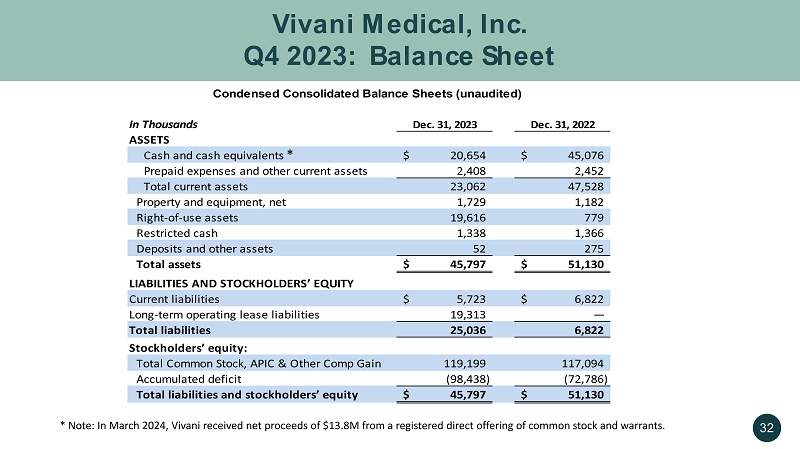 Vivani Medical, Inc. Q4 2023: P&L Statement 31 In Thousands, except per Share Data Dec. 31, 2023 Dec. 31, 2022 Dec. 31, 2023 Dec. 31, 2022 Operating expenses: Research and development, net of grants 4,708$ 4,427$ 16,968$ 14,169$ General and administrative, net of grants 1,509 3,363 9,997 7,072 Total operating expenses 6,217 7,790 26,965 21,241 Loss from operations (6,217) (7,790) (26,965) (21,241) Other income (expense), net 191 506 1,313 7,352 Net loss (6,026)$ (7,284)$ (25,652)$ (13,889)$ Net loss per common share – basic (0.12)$ (0.14)$ (0.50)$ (0.36)$ Net loss per common share – diluted (0.12)$ (0.14)$ (0.50)$ (0.36)$ Weighted average common shares outstanding – basic 51,025 50,736 50,853 38,241 Weighted average common shares outstanding – diluted 51,025 50,736 50,853 38,241 Three Months Ended Twelve Months Ended Condensed Consolidated Statements of Operations (unaudited)