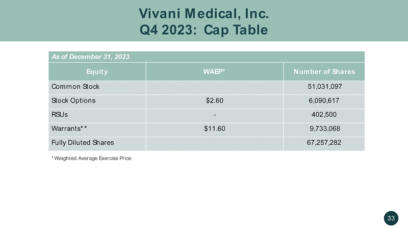 Vivani Medical, Inc. Q4 2023: Cap Table 33 As of December 31, 2023 Equity WAEP* Number of Shares Common Stock 51,031,097 Stock Options $2.60 6,090,617 RSUs - 402,500 Warrants** $11.60 9,733,068 Fully Diluted Shares 67,257,282 *Weighted Average Exercise Price