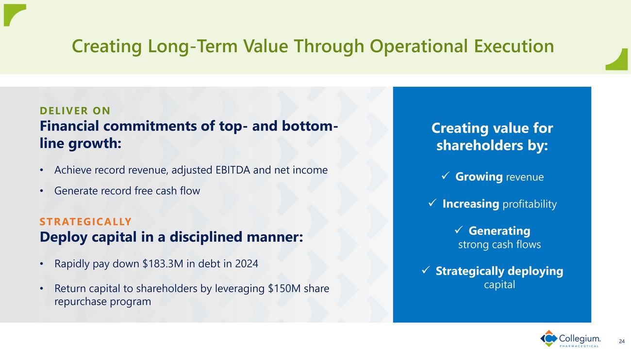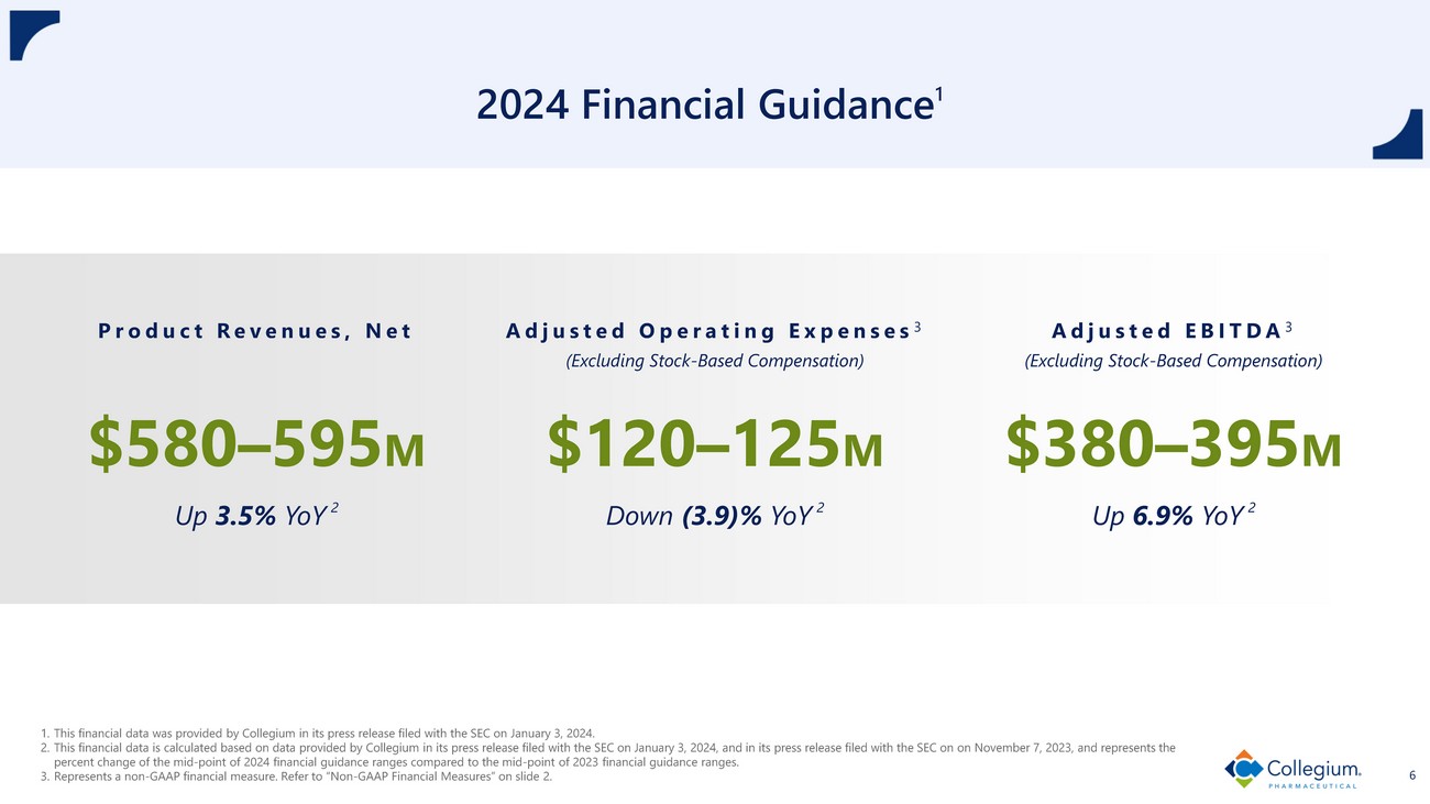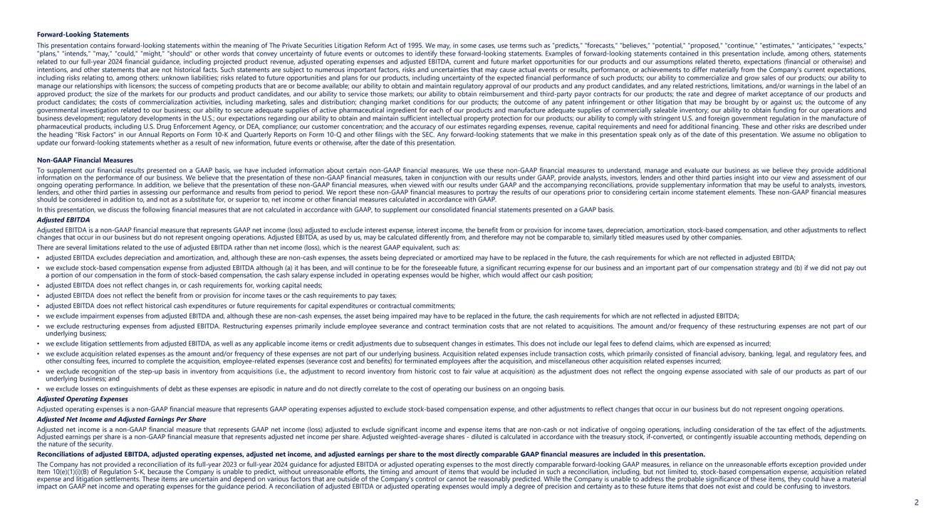 Forward - Looking Statements This presentation contains forward - looking statements within the meaning of The Private Securities Litigation Reform Act of 1995 . We may, in some cases, use terms such as "predicts," "forecasts," "believes," "potential," "proposed," "continue," "estimates," "anticipates," "expects," "plans," "intends," "may," "could," "might," "should" or other words that convey uncertainty of future events or outcomes to identify these forward - looking statements . Examples of forward - looking statements contained in this presentation include, among others, statements related to our full - year 2024 financial guidance, including projected product revenue, adjusted operating expenses and adjusted EBITDA, current and future market opportunities for our products and our assumptions related thereto, expectations (financial or otherwise) and intentions, and other statements that are not historical facts . Such statements are subject to numerous important factors, risks and uncertainties that may cause actual events or results, performance, or achievements to differ materially from the Company's current expectations, including risks relating to, among others : unknown liabilities ; risks related to future opportunities and plans for our products, including uncertainty of the expected financial performance of such products ; our ability to commercialize and grow sales of our products ; our ability to manage our relationships with licensors ; the success of competing products that are or become available ; our ability to obtain and maintain regulatory approval of our products and any product candidates, and any related restrictions, limitations, and/or warnings in the label of an approved product ; the size of the markets for our products and product candidates, and our ability to service those markets ; our ability to obtain reimbursement and third - party payor contracts for our products ; the rate and degree of market acceptance of our products and product candidates ; the costs of commercialization activities, including marketing, sales and distribution ; changing market conditions for our products ; the outcome of any patent infringement or other litigation that may be brought by or against us ; the outcome of any governmental investigation related to our business ; our ability to secure adequate supplies of active pharmaceutical ingredient for each of our products and manufacture adequate supplies of commercially saleable inventory ; our ability to obtain funding for our operations and business development ; regulatory developments in the U . S .; our expectations regarding our ability to obtain and maintain sufficient intellectual property protection for our products ; our ability to comply with stringent U . S . and foreign government regulation in the manufacture of pharmaceutical products, including U . S . Drug Enforcement Agency, or DEA, compliance ; our customer concentration ; and the accuracy of our estimates regarding expenses, revenue, capital requirements and need for additional financing . These and other risks are described under the heading "Risk Factors" in our Annual Reports on Form 10 - K and Quarterly Reports on Form 10 - Q and other filings with the SEC . Any forward - looking statements that we make in this presentation speak only as of the date of this presentation . We assume no obligation to update our forward - looking statements whether as a result of new information, future events or otherwise, after the date of this presentation . Non - GAAP Financial Measures To supplement our financial results presented on a GAAP basis, we have included information about certain non - GAAP financial measures . We use these non - GAAP financial measures to understand, manage and evaluate our business as we believe they provide additional information on the performance of our business . We believe that the presentation of these non - GAAP financial measures, taken in conjunction with our results under GAAP, provide analysts, investors, lenders and other third parties insight into our view and assessment of our ongoing operating performance . In addition, we believe that the presentation of these non - GAAP financial measures, when viewed with our results under GAAP and the accompanying reconciliations, provide supplementary information that may be useful to analysts, investors, lenders, and other third parties in assessing our performance and results from period to period . We report these non - GAAP financial measures to portray the results of our operations prior to considering certain income statement elements . These non - GAAP financial measures should be considered in addition to, and not as a substitute for, or superior to, net income or other financial measures calculated in accordance with GAAP . In this presentation, we discuss the following financial measures that are not calculated in accordance with GAAP, to supplement our consolidated financial statements presented on a GAAP basis . Adjusted EBITDA Adjusted EBITDA is a non - GAAP financial measure that represents GAAP net income (loss) adjusted to exclude interest expense, interest income, the benefit from or provision for income taxes, depreciation, amortization, stock - based compensation, and other adjustments to reflect changes that occur in our business but do not represent ongoing operations . Adjusted EBITDA, as used by us, may be calculated differently from, and therefore may not be comparable to, similarly titled measures used by other companies . There are several limitations related to the use of adjusted EBITDA rather than net income (loss), which is the nearest GAAP equivalent, such as : • adjusted EBITDA excludes depreciation and amortization, and, although these are non - cash expenses, the assets being depreciated or amortized may have to be replaced in the future, the cash requirements for which are not reflected in adjusted EBITDA ; • we exclude stock - based compensation exp
