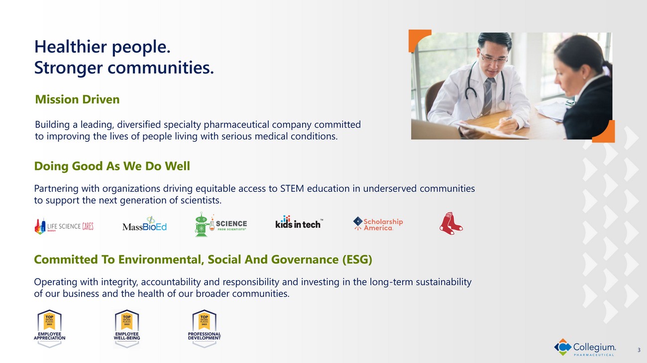 Healthier people. Stronger communities. Mission Driven Building a leading, diversified specialty pharmaceutical company committed to improving the lives of people living with serious medical conditions. Doing Good As We Do Well Partnering with organizations driving equitable access to STEM education in underserved communities to support the next generation of scientists. Committed To Environmental, Social And Governance (ESG) Operating with integrity, accountability and responsibility and investing in the long - term sustainability of our business and the health of our broader communities. 3
