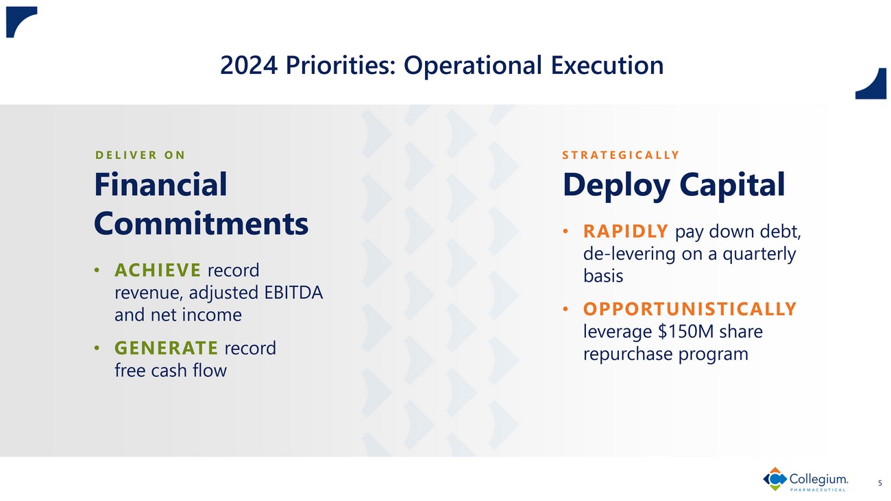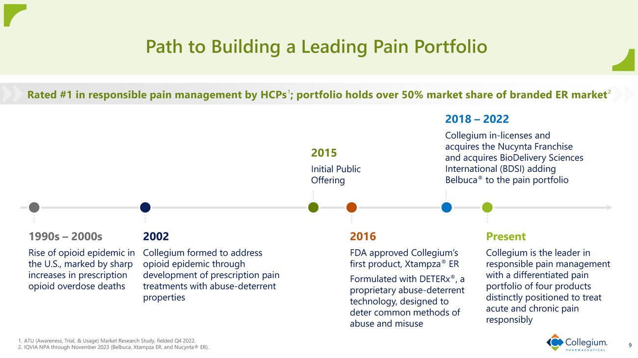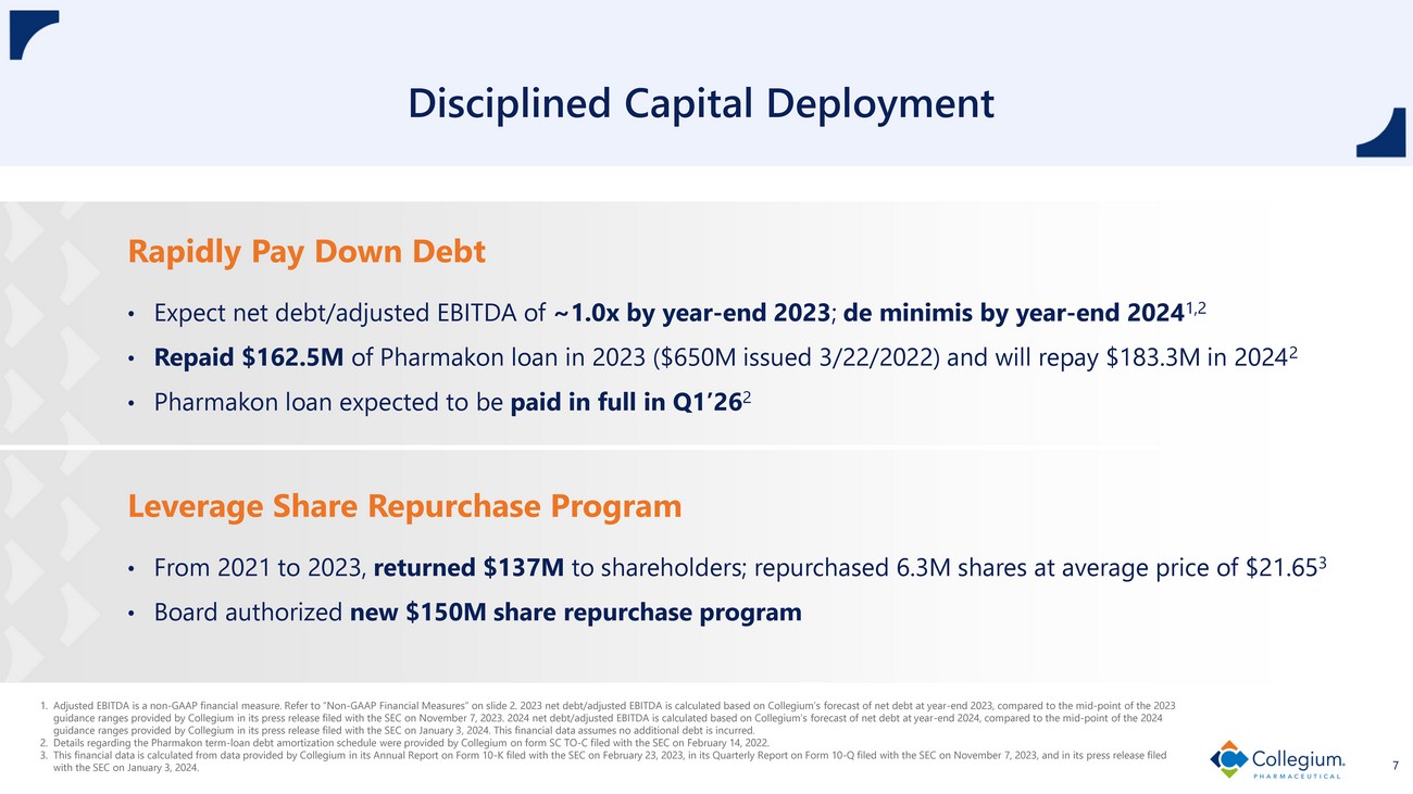 Disciplined Capital Deployment 7 1. Adjusted EBITDA is a non - GAAP financial measure. Refer to “Non - GAAP Financial Measures” on slide 2. 2023 net debt/adjusted EBITD A is calculated based on Collegium’s forecast of net debt at year - end 2023, compared to the mid - point of the 2023 guidance ranges provided by Collegium in its press release filed with the SEC on Novembe r 7, 2023 . 2024 net debt/adjusted EBITDA is calculated based on Collegium’s forecast of net debt at year - end 2024, compared to the mid - po int of the 2024 guidance ranges provided by Collegium in its press release filed with the SEC on January 3 , 2024 . This financial data assumes no additional debt is incurred. 2. Details regarding the Pharmakon term - loan debt amortization schedule were provided by Collegium on form SC TO - C filed with the S EC on February 14, 2022. 3. This financial data is calculated from data provided by Collegium in its Annual Report on Form 10 - K filed with the SEC on Februa ry 23, 2023, in its Quarterly Report on Form 10 - Q filed with the SEC on November 7, 2023, and in its press release filed with the SEC on January 3, 2024 . Rapidly Pay Down Debt • Expect n et debt/adjusted EBITDA of ~1.0 x by year - end 2023 ; de minimis by year - end 2024 1,2 • Repaid $162.5M of Pharmakon loan in 2023 ($650M issued 3/22/2022) and will repay $183.3M in 2024 2 • Pharmakon loan expected to be paid in full in Q1’26 2 Leverage Share Repurchase Program • From 2021 to 2023, returned $137M to shareholders ; repurchased 6.3M shares at average price of $21.65 3 • Board authorized new $150M share repurchase program