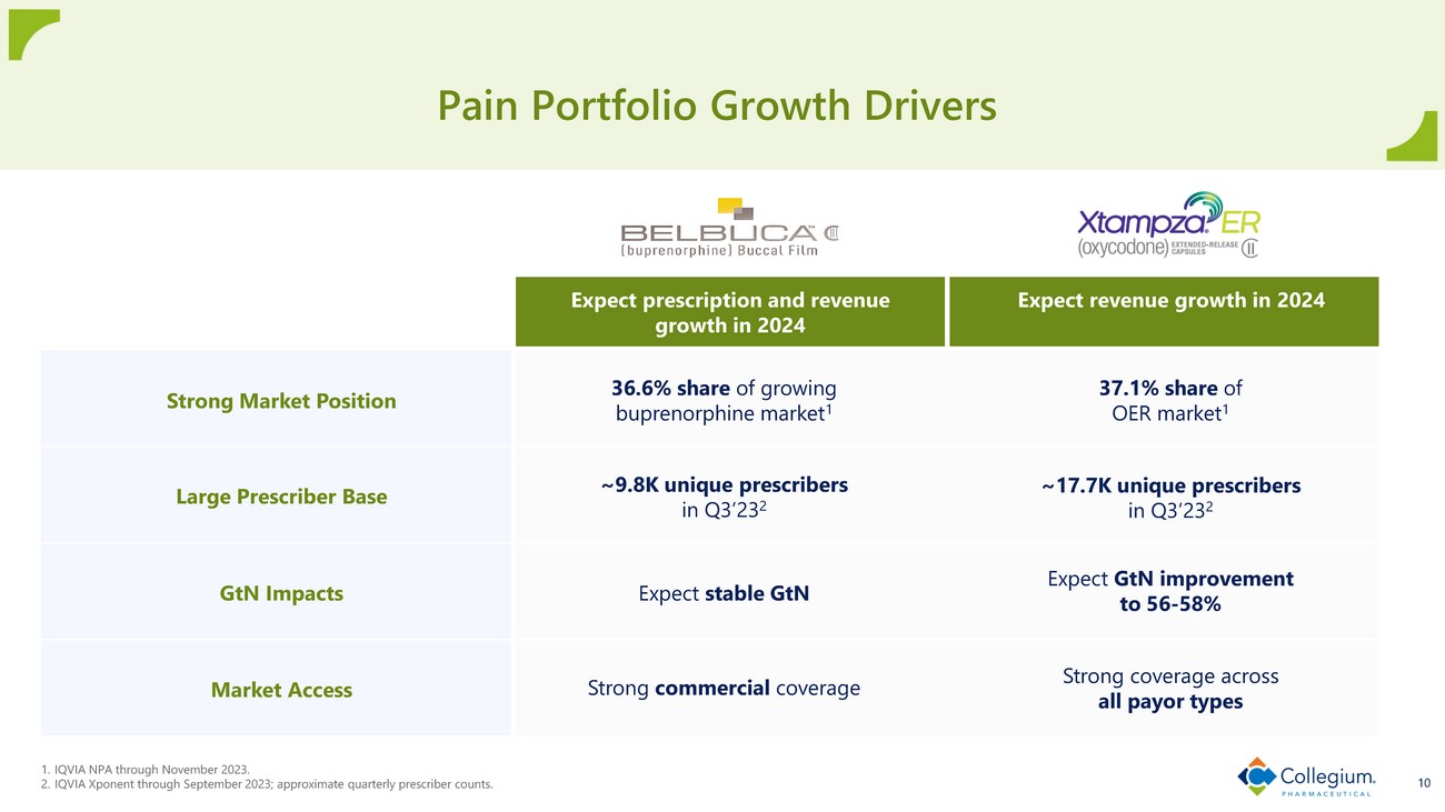 1. ATU (Awareness, Trial, & Usage) Market Research Study, fielded Q4 2022. 2. IQVIA NPA through November 2023 (Belbuca, Xtampza ER, and Nucynta® ER). 9 Path to Building a Leading Pain Portfolio 1990s – 2000s Rise of opioid epidemic in the U.S., marked by sharp increases in prescription opioid overdose deaths 2002 Collegium formed to address opioid epidemic through development of prescription pain treatments with abuse - deterrent properties 2015 Initial Public Offering 2016 FDA approved Collegium’s first product, Xtampza ® ER Formulated with DETERx ® , a proprietary abuse - deterrent technology, designed to deter common methods of abuse and misuse 2018 – 2022 Collegium in - licenses and acquires the Nucynta Franchise and acquires BioDelivery Sciences International (BDSI) adding Belbuca ® to the pain portfolio Present Collegium is the leader in responsible pain management with a differentiated pain portfolio of four products distinctly positioned to treat acute and chronic pain responsibly Rated #1 in responsible pain management by HCPs 1 ; portfolio holds over 50% market share of branded ER market 2