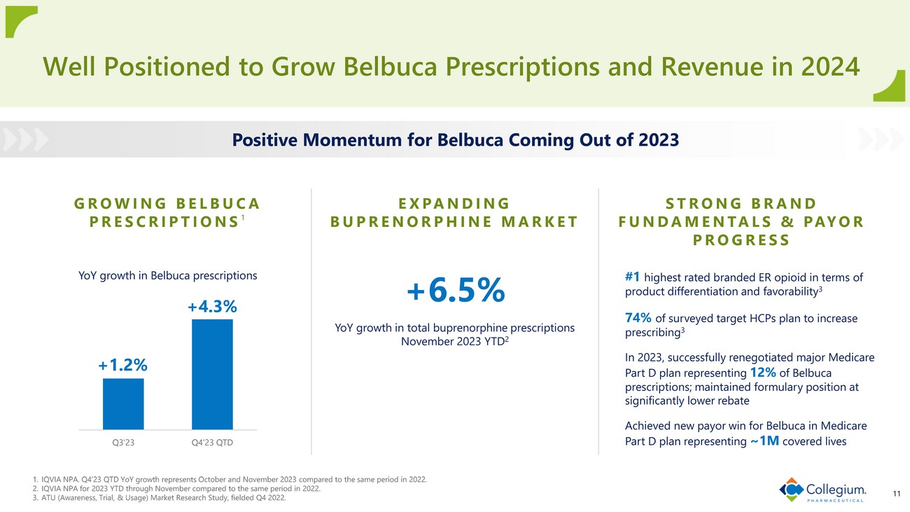 1. IQVIA NPA through November 2023. 2. IQVIA Xponent through September 2023; approximate quarterly prescriber counts. 10 Pain Portfolio Growth Drivers Expect prescription and revenue growth in 2024 Expect revenue growth in 2024 Strong Market Position 36.6% share of growing buprenorphine market 1 Large Prescriber Base GtN Impacts Market Access ~9.8K unique prescribers in Q3’23 2 Expect stable GtN Strong commercial coverage 37.1% share of OER market 1 ~17.7K unique prescribers in Q3’23 2 Expect GtN improvement to 56 - 58% Strong coverage across all payor types