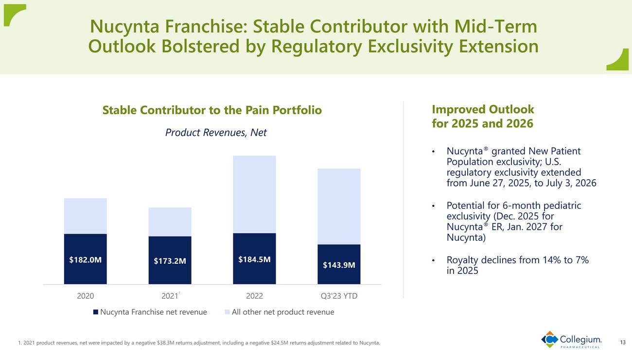 1. 2021 product revenues, net were impacted by a negative $38.3M returns adjustment, including a negative $24.5M returns adju stm ent related to Nucynta. 13 Nucynta Franchise: Stable Contributor with Mid - Term Outlook Bolstered by Regulatory Exclusivity Extension Stable Contributor to the Pain Portfolio $182.0M $173.2M $184.5M $143.9M 2020 2021 2022 Q3'23 YTD Product Revenues, Net Nucynta Franchise net revenue All other net product revenue Improved Outlook for 2025 and 2026 • Nucynta ® granted New Patient Population exclusivity; U.S. regulatory exclusivity extended from June 27, 2025, to July 3, 2026 • Potential for 6 - month pediatric exclusivity (Dec. 2025 for Nucynta ® ER, Jan. 2027 for Nucynta) • Royalty declines from 14% to 7% in 2025 1