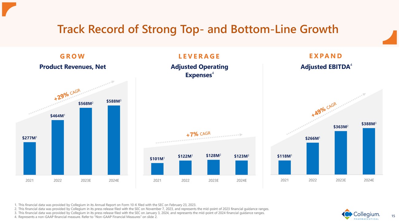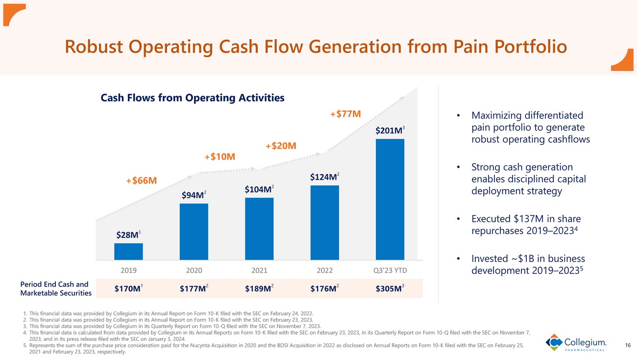 15 Track Record of Strong Top - and Bottom - Line Growth 1. This financial data was provided by Collegium in its Annual Report on Form 10 - K filed with the SEC on February 23, 2023. 2. This financial data was provided by Collegium in its press release filed with the SEC on November 7, 2023, and represents the mid - point of 2023 financial guidance ranges. 3. This financial data was provided by Collegium in its press release filed with the SEC on January 3, 2024, and represents the mid - point of 2024 financial guidance ranges. 4. Represents a non - GAAP financial measure. Refer to “Non - GAAP Financial Measures” on slide 2. GROW LEVERAGE EXPAND $277M 1 $464M 1 $568M 2 $588M 3 2021 2022 2023E 2024E Product Revenues, Net $101M 1 $122M 1 $128M 2 $123M 3 2021 2022 2023E 2024E Adjusted Operating Expenses 4 $118M 1 $266M 1 $363M 2 $388M 3 2021 2022 2023E 2024E Adjusted EBITDA 4
