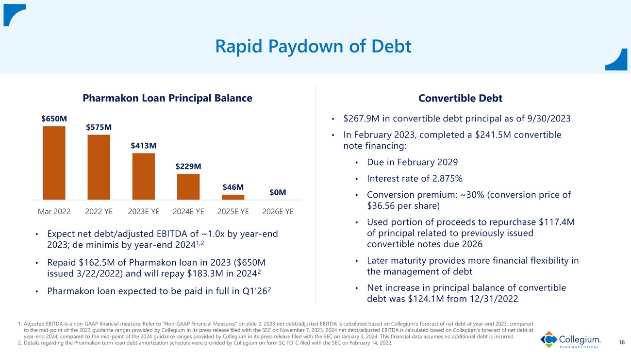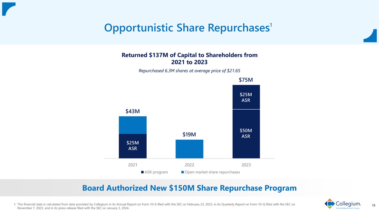 $650M $575M $413M $229M $46M $0M Mar 2022 2022 YE 2023E YE 2024E YE 2025E YE 2026E YE Pharmakon Loan Principal Balance 1. Adjusted EBITDA is a non - GAAP financial measure. Refer to “Non - GAAP Financial Measures” on slide 2. 2023 net debt/adjusted EBITD A is calculated based on Collegium’s forecast of net debt at year - end 2023, compared to the mid - point of the 2023 guidance ranges provided by Collegium in its press release filed with the SEC on Novembe r 7, 2023 . 2024 net debt/adjusted EBITDA is calculated based on Collegium’s forecast of net debt at year - end 2024, compared to the mid - point of the 2024 guidance ranges provided by Collegium in its press release filed with the S EC on January 3 , 2024 . This financial data assumes no additional debt is incurred. 2. Details regarding the Pharmakon term - loan debt amortization schedule were provided by Collegium on form SC TO - C filed with the S EC on February 14, 2022. 18 Rapid Paydown of Debt • Expect n et debt/adjusted EBITDA of ~1.0 x by year - end 2023; de minimis by year - end 2024 1,2 • Repaid $162.5M of Pharmakon loan in 2023 ($650M issued 3/22/2022) and will repay $183.3M in 2024 2 • Pharmakon loan expected to be paid in full in Q1’26 2 Convertible Debt • $267.9M in convertible debt principal as of 9/30/2023 • In February 2023, completed a $241.5M convertible note financing: • Due in February 2029 • Interest rate of 2.875% • Conversion premium: ~30% (conversion price of $36.56 per share) • Used portion of proceeds to repurchase $117.4M of principal related to previously issued convertible notes due 2026 • Later maturity provides more financial flexibility in the management of debt • Net increase in principal balance of convertible debt was $124.1M from 12/31/2022