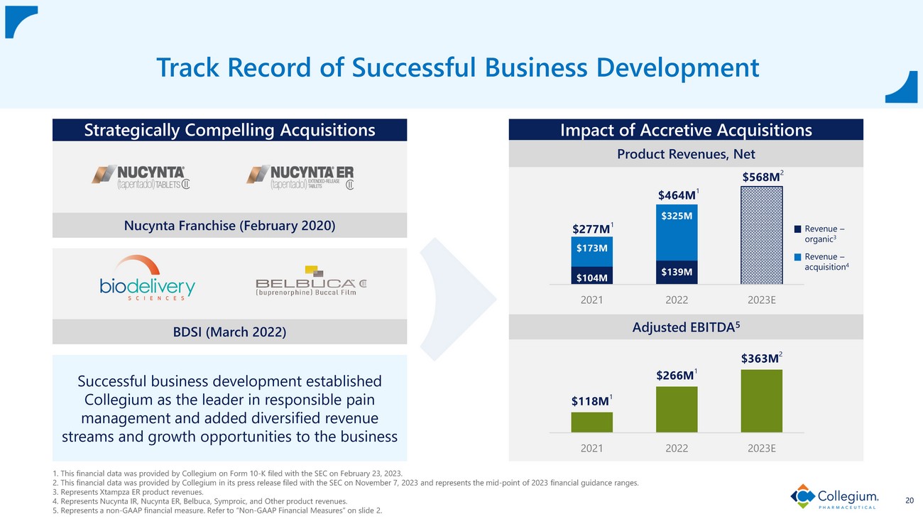 2021 2022 2023 ASR program Open market share repurchases 19 Opportunistic Share Repurchases 1 1. This financial data is calculated from data provided by Collegium in its Annual Report on Form 10 - K filed with the SEC on Februa ry 23, 2023 , in its Quarterly Report on Form 10 - Q filed with the SEC on November 7, 2023, and in its press release filed with the SEC on January 3, 2024. $43M $19M $75M $25M ASR $50M ASR $25M ASR Returned $137M of Capital to Shareholders from 2021 to 2023 Repurchased 6.3M shares at average price of $21.65 Board Authorized New $150M Share Repurchase Program