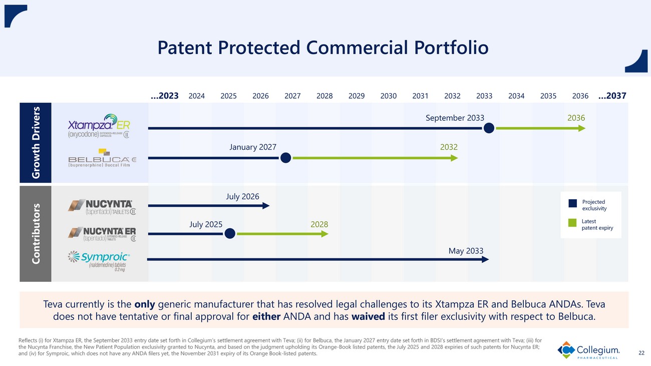 Reflects (i) for Xtampza ER, the September 2033 entry date set forth in Collegium’s settlement agreement with Teva; (ii) for Bel buca, the January 2027 entry date set forth in BDSI’s settlement agreement with Teva; (iii) for the Nucynta Franchise, the New Patient Population exclusivity granted to Nucynta, and based on the judgment upholding its Ora nge - Book listed patents, the July 2025 and 2028 expiries of such patents for Nucynta ER; and (iv) for Symproic, which does not have any ANDA filers yet, the November 2031 expiry of its Orange Book - listed patents. 22 Patent Protected Commercial Portfolio September 2033 Growth Drivers Contributors …2023 2024 2025 2026 2027 2028 2029 2030 2031 2032 2033 2034 2035 2036 …2037 January 2027 July 2026 July 2025 May 2033 Projected exclusivity Latest patent expiry Teva currently is the only generic manufacturer that has resolved legal challenges to its Xtampza ER and Belbuca ANDAs. Teva does not have tentative or final approval for either ANDA and has waived its first filer exclusivity with respect to Belbuca . 2036 2032 2028