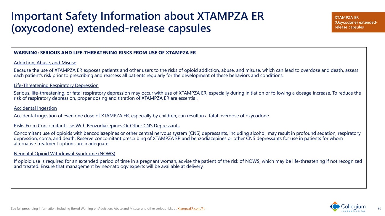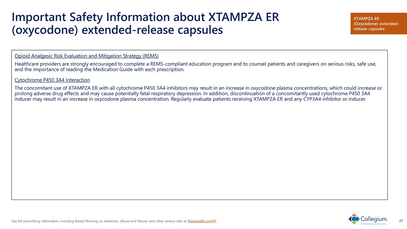 See full prescribing information, including Boxed Warning on Addiction, Abuse and Misuse, and other serious risks at XtampzaER.com/PI . 26 Important Safety Information about XTAMPZA ER (oxycodone) extended - release capsules WARNING: SERIOUS AND LIFE - THREATENING RISKS FROM USE OF XTAMPZA ER Addiction, Abuse, and Misuse Because the use of XTAMPZA ER exposes patients and other users to the risks of opioid addiction, abuse, and misuse, which can le ad to overdose and death, assess each patient’s risk prior to prescribing and reassess all patients regularly for the development of these behaviors and condi tio ns. Life - Threatening Respiratory Depression Serious, life - threatening, or fatal respiratory depression may occur with use of XTAMPZA ER, especially during initiation or fol lowing a dosage increase. To reduce the risk of respiratory depression, proper dosing and titration of XTAMPZA ER are essential. Accidental Ingestion Accidental ingestion of even one dose of XTAMPZA ER, especially by children, can result in a fatal overdose of oxycodone. Risks From Concomitant Use With Benzodiazepines Or Other CNS Depressants Concomitant use of opioids with benzodiazepines or other central nervous system (CNS) depressants, including alcohol, may res ult in profound sedation, respiratory depression, coma, and death. Reserve concomitant prescribing of XTAMPZA ER and benzodiazepines or other CNS depressants for u se in patients for whom alternative treatment options are inadequate. Neonatal Opioid Withdrawal Syndrome (NOWS) If opioid use is required for an extended period of time in a pregnant woman, advise the patient of the risk of NOWS, which m ay be life - threatening if not recognized and treated. Ensure that management by neonatology experts will be available at delivery. XTAMPZA ER (Oxycodone) extended - release capsules