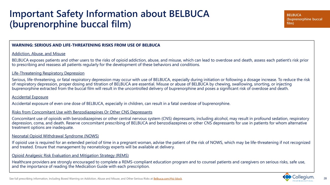 See full prescribing information, including Boxed Warning on Addiction, Abuse and Misuse, and Other Serious Risks at Belbuca.com/#isi - block . 28 Important Safety Information about BELBUCA (buprenorphine buccal film) WARNING: SERIOUS AND LIFE - THREATENING RISKS FROM USE OF BELBUCA Addiction, Abuse, and Misuse BELBUCA exposes patients and other users to the risks of opioid addiction, abuse, and misuse, which can lead to overdose and dea th, assess each patient’s risk prior to prescribing and reassess all patients regularly for the development of these behaviors and conditions. Life - Threatening Respiratory Depression Serious, life - threatening, or fatal respiratory depression may occur with use of BELBUCA, especially during initiation or follow ing a dosage increase. To reduce the risk of respiratory depression, proper dosing and titration of BELBUCA are essential. Misuse or abuse of BELBUCA by chewing, swall owi ng, snorting, or injecting buprenorphine extracted from the buccal film will result in the uncontrolled delivery of buprenorphine and poses a significan t r isk of overdose and death. Accidental Exposure Accidental exposure of even one dose of BELBUCA, especially in children, can result in a fatal overdose of buprenorphine. Risks from Concomitant Use with Benzodiazepines Or Other CNS Depressants Concomitant use of opioids with benzodiazepines or other central nervous system (CNS) depressants, including alcohol, may res ult in profound sedation, respiratory depression, coma, and death. Reserve concomitant prescribing of BELBUCA and benzodiazepines or other CNS depressants for use in patients for whom alternative treatment options are inadequate. Neonatal Opioid Withdrawal Syndrome (NOWS) If opioid use is required for an extended period of time in a pregnant woman, advise the patient of the risk of NOWS, which m ay be life - threatening if not recognized and treated. Ensure that management by neonatology experts will be available at delivery. Opioid Analgesic Risk Evaluation and Mitigation Strategy (REMS) Healthcare providers are strongly encouraged to complete a REMS - compliant education program and to counsel patients and caregive rs on serious risks, safe use, and the importance of reading the Medication Guide with each prescription. BELBUCA (buprenorphine buccal film)