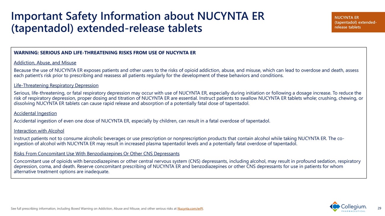 See full prescribing information, including Boxed Warning on Addiction, Abuse and Misuse, and other serious risks at Nucynta.com/erPI . 29 Important Safety Information about NUCYNTA ER (tapentadol) extended - release tablets WARNING: SERIOUS AND LIFE - THREATENING RISKS FROM USE OF NUCYNTA ER Addiction, Abuse, and Misuse Because the use of NUCYNTA ER exposes patients and other users to the risks of opioid addiction, abuse, and misuse, which can le ad to overdose and death, assess each patient’s risk prior to prescribing and reassess all patients regularly for the development of these behaviors and condi tio ns. Life - Threatening Respiratory Depression Serious, life - threatening, or fatal respiratory depression may occur with use of NUCYNTA ER, especially during initiation or fol lowing a dosage increase. To reduce the risk of respiratory depression, proper dosing and titration of NUCYNTA ER are essential. Instruct patients to swallow NUCYNTA ER tablets whole; crushing, chewing, or dissolving NUCYNTA ER tablets can cause rapid release and absorption of a potentially fatal dose of tapentadol . Accidental Ingestion Accidental ingestion of even one dose of NUCYNTA ER, especially by children, can result in a fatal overdose of tapentadol . Interaction with Alcohol Instruct patients not to consume alcoholic beverages or use prescription or nonprescription products that contain alcohol whi le taking NUCYNTA ER. The co - ingestion of alcohol with NUCYNTA ER may result in increased plasma tapentadol levels and a potentially fatal overdose of tapentadol . Risks From Concomitant Use With Benzodiazepines Or Other CNS Depressants Concomitant use of opioids with benzodiazepines or other central nervous system (CNS) depressants, including alcohol, may res ult in profound sedation, respiratory depression, coma, and death. Reserve concomitant prescribing of NUCYNTA ER and benzodiazepines or other CNS depressants for u se in patients for whom alternative treatment options are inadequate. NUCYNTA ER (tapentadol) extended - release tablets