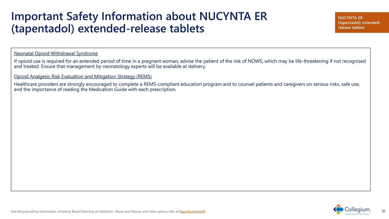 See full prescribing information, including Boxed Warning on Addiction, Abuse and Misuse, and other serious risks at Nucynta.com/erPI . 30 Important Safety Information about NUCYNTA ER (tapentadol) extended - release tablets Neonatal Opioid Withdrawal Syndrome If opioid use is required for an extended period of time in a pregnant woman, advise the patient of the risk of NOWS, which m ay be life - threatening if not recognized and treated. Ensure that management by neonatology experts will be available at delivery. Opioid Analgesic Risk Evaluation and Mitigation Strategy (REMS) Healthcare providers are strongly encouraged to complete a REMS - compliant education program and to counsel patients and caregive rs on serious risks, safe use, and the importance of reading the Medication Guide with each prescription. NUCYNTA ER (tapentadol) extended - release tablets