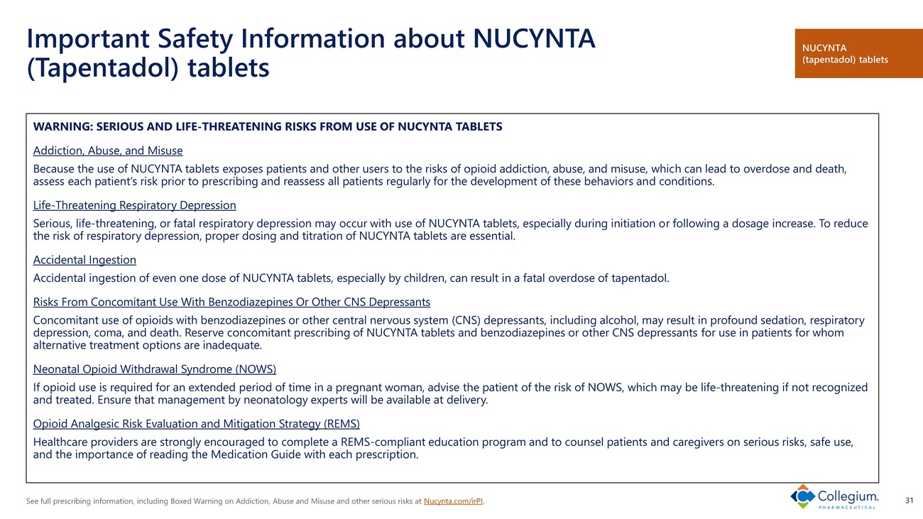 See full prescribing information, including Boxed Warning on Addiction, Abuse and Misuse and other serious risks at Nucynta.com/irPI . 31 Important Safety Information about NUCYNTA (Tapentadol) tablets WARNING: SERIOUS AND LIFE - THREATENING RISKS FROM USE OF NUCYNTA TABLETS Addiction, Abuse, and Misuse Because the use of NUCYNTA tablets exposes patients and other users to the risks of opioid addiction, abuse, and misuse, whic h c an lead to overdose and death, assess each patient’s risk prior to prescribing and reassess all patients regularly for the development of these behaviors an d c onditions. Life - Threatening Respiratory Depression Serious, life - threatening, or fatal respiratory depression may occur with use of NUCYNTA tablets, especially during initiation o r following a dosage increase. To reduce the risk of respiratory depression, proper dosing and titration of NUCYNTA tablets are essential. Accidental Ingestion Accidental ingestion of even one dose of NUCYNTA tablets, especially by children, can result in a fatal overdose of tapentadol . Risks From Concomitant Use With Benzodiazepines Or Other CNS Depressants Concomitant use of opioids with benzodiazepines or other central nervous system (CNS) depressants, including alcohol, may res ult in profound sedation, respiratory depression, coma, and death. Reserve concomitant prescribing of NUCYNTA tablets and benzodiazepines or other CNS depressants for use in patients for whom alternative treatment options are inadequate. Neonatal Opioid Withdrawal Syndrome (NOWS) If opioid use is required for an extended period of time in a pregnant woman, advise the patient of the risk of NOWS, which m ay be life - threatening if not recognized and treated. Ensure that management by neonatology experts will be available at delivery. Opioid Analgesic Risk Evaluation and Mitigation Strategy (REMS) Healthcare providers are strongly encouraged to complete a REMS - compliant education program and to counsel patients and caregive rs on serious risks, safe use, and the importance of reading the Medication Guide with each prescription. NUCYNTA (tapentadol) tablets