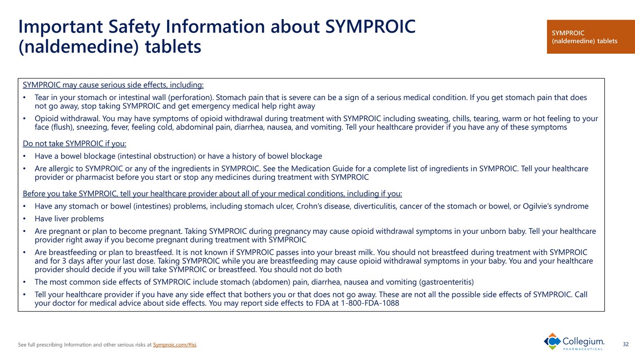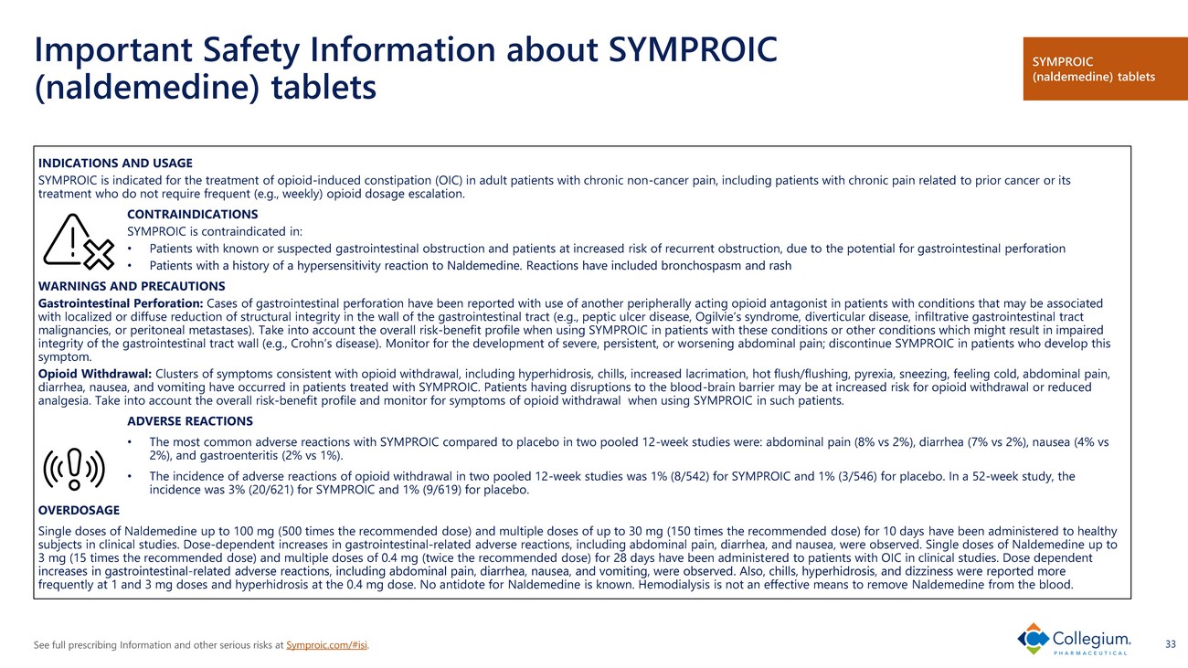 See full prescribing Information and other s erious risks at Symproic.com/#isi . 32 Important Safety Information about SYMPROIC (naldemedine) tablets SYMPROIC may cause serious side effects, including: • Tear in your stomach or intestinal wall (perforation). Stomach pain that is severe can be a sign of a serious medical conditi on. If you get stomach pain that does not go away, stop taking SYMPROIC and get emergency medical help right away • Opioid withdrawal. You may have symptoms of opioid withdrawal during treatment with SYMPROIC including sweating, chills, tear ing , warm or hot feeling to your face (flush), sneezing, fever, feeling cold, abdominal pain, diarrhea, nausea, and vomiting. Tell your healthcare provider if yo u have any of these symptoms Do not take SYMPROIC if you: • Have a bowel blockage (intestinal obstruction) or have a history of bowel blockage • Are allergic to SYMPROIC or any of the ingredients in SYMPROIC. See the Medication Guide for a complete list of ingredients i n S YMPROIC. Tell your healthcare provider or pharmacist before you start or stop any medicines during treatment with SYMPROIC Before you take SYMPROIC, tell your healthcare provider about all of your medical conditions, including if you: • Have any stomach or bowel (intestines) problems, including stomach ulcer, Crohn’s disease, diverticulitis, cancer of the stom ach or bowel, or Ogilvie’s syndrome • Have liver problems • Are pregnant or plan to become pregnant. Taking SYMPROIC during pregnancy may cause opioid withdrawal symptoms in your unborn ba by. Tell your healthcare provider right away if you become pregnant during treatment with SYMPROIC • Are breastfeeding or plan to breastfeed. It is not known if SYMPROIC passes into your breast milk. You should not breastfeed dur ing treatment with SYMPROIC and for 3 days after your last dose. Taking SYMPROIC while you are breastfeeding may cause opioid withdrawal symptoms in your ba by. You and your healthcare provider should decide if you will take SYMPROIC or breastfeed. You should not do both • The most common side effects of SYMPROIC include stomach (abdomen) pain, diarrhea, nausea and vomiting (gastroenteritis) • Tell your healthcare provider if you have any side effect that bothers you or that does not go away. These are not all the po ssi ble side effects of SYMPROIC. Call your doctor for medical advice about side effects. You may report side effects to FDA at 1 - 800 - FDA - 1088 SYMPROIC (naldemedine) tablets