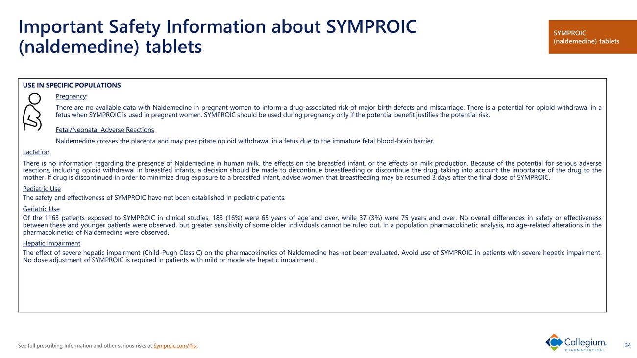 See full prescribing Information and other s erious risks at Symproic.com/#isi . 33 Important Safety Information about SYMPROIC ( naldemedine ) tablets INDICATIONS AND USAGE SYMPROIC is indicated for the treatment of opioid - induced constipation (OIC) in adult patients with chronic non - cancer pain, inc luding patients with chronic pain related to prior cancer or its treatment who do not require frequent (e.g., weekly) opioid dosage escalation. CONTRAINDICATIONS SYMPROIC is contraindicated in: • Patients with known or suspected gastrointestinal obstruction and patients at increased risk of recurrent obstruction, due to th e potential for gastrointestinal perforation • Patients with a history of a hypersensitivity reaction to Naldemedine . Reactions have included bronchospasm and rash WARNINGS AND PRECAUTIONS Gastrointestinal Perforation: Cases of gastrointestinal perforation have been reported with use of another peripherally acting opioid antagonist in patient s w ith conditions that may be associated with localized or diffuse reduction of structural integrity in the wall of the gastrointestinal tract (e.g., peptic ulcer dis eas e, Ogilvie’s syndrome, diverticular disease, infiltrative gastrointestinal tract malignancies, or peritoneal metastases). Take into account the overall risk - benefit profile when using SYMPROIC in patients with these conditions or other conditions which might result in impaired integrity of the gastrointestinal tract wall (e.g., Crohn’s disease). Monitor for the development of severe, persistent, or w ors ening abdominal pain; discontinue SYMPROIC in patients who develop this symptom. Opioid Withdrawal: Clusters of symptoms consistent with opioid withdrawal, including hyperhidrosis, chills, increased lacrimation, hot flush/flu shi ng, pyrexia, sneezing, feeling cold, abdominal pain, diarrhea, nausea, and vomiting have occurred in patients treated with SYMPROIC. Patients having disruptions to the blood - brain b arrier may be at increased risk for opioid withdrawal or reduced analgesia. Take into account the overall risk - benefit profile and monitor for symptoms of opioid withdrawal when using SYMPROIC in such patients. ADVERSE REACTIONS • The most common adverse reactions with SYMPROIC compared to placebo in two pooled 12 - week studies were: abdominal pain (8% vs 2% ), diarrhea (7% vs 2%), nausea (4% vs 2%), and gastroenteritis (2% vs 1%). • The incidence of adverse reactions of opioid withdrawal in two pooled 12 - week studies was 1% (8/542) for SYMPROIC and 1% (3/546) for placebo. In a 52 - week study, the incidence was 3% (20/621) for SYMPROIC and 1% (9/619) for placebo. OVERDOSAGE Single doses of Naldemedine up to 100 mg (500 times the recommended dose) and multiple doses of up to 30 mg (150 times the recommended dose) for 10 days ha ve been administered to healthy subjects in clinical studies. Dose - dependent increases in gastrointestinal - related adverse reactions, including abdominal pain, diarrhea, and nausea, were observed. Single doses of Naldemedine up to 3 mg (15 times the recommended dose) and multiple doses of 0.4 mg (twice the recommended dose) for 28 days have been administ ere d to patients with OIC in clinical studies. Dose dependent increases in gastrointestinal - related adverse reactions, including abdominal pain, diarrhea, nausea, and vomiting, were observed . Also, chills, hyperhidrosis, and dizziness were reported more frequently at 1 and 3 mg doses and hyperhidrosis at the 0.4 mg dose. No antidote for Naldemedine is known. Hemodialysis is not an effective means to remove Naldemedine from the blood. SYMPROIC ( naldemedine ) tablets