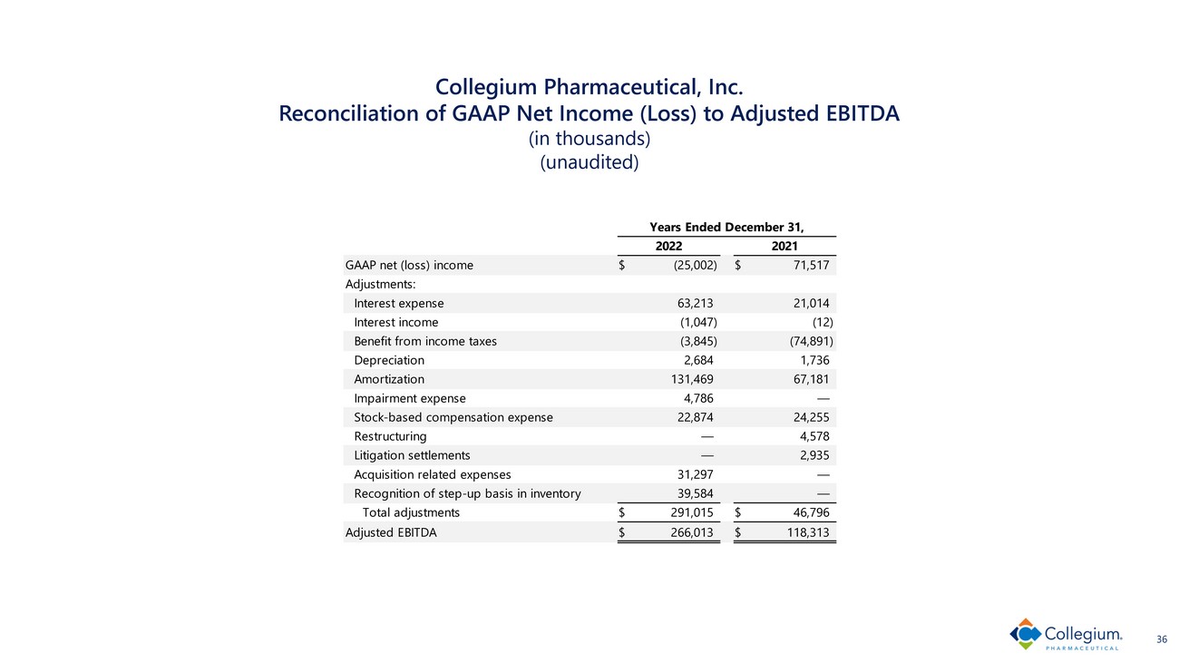 Collegium Pharmaceutical, Inc. Reconciliation of GAAP Net Income (Loss) to Adjusted EBITDA (in thousands) (unaudited) 36 GAAP net (loss) income $ (25,002) $ 71,517 Adjustments: Interest expense 63,213 21,014 Interest income (1,047) (12) Benefit from income taxes (3,845) (74,891) Depreciation 2,684 1,736 Amortization 131,469 67,181 Impairment expense 4,786 — Stock-based compensation expense 22,874 24,255 Restructuring — 4,578 Litigation settlements — 2,935 Acquisition related expenses 31,297 — Recognition of step-up basis in inventory 39,584 — Total adjustments $ 291,015 $ 46,796 Adjusted EBITDA $ 266,013 $ 118,313 Years Ended December 31, 2022 2021