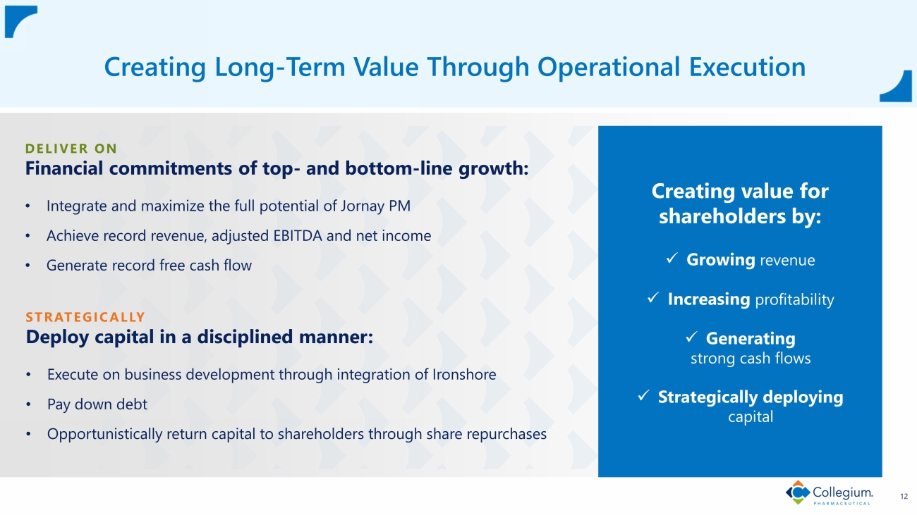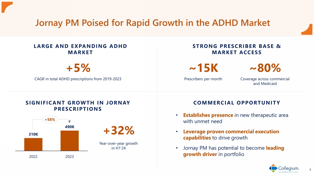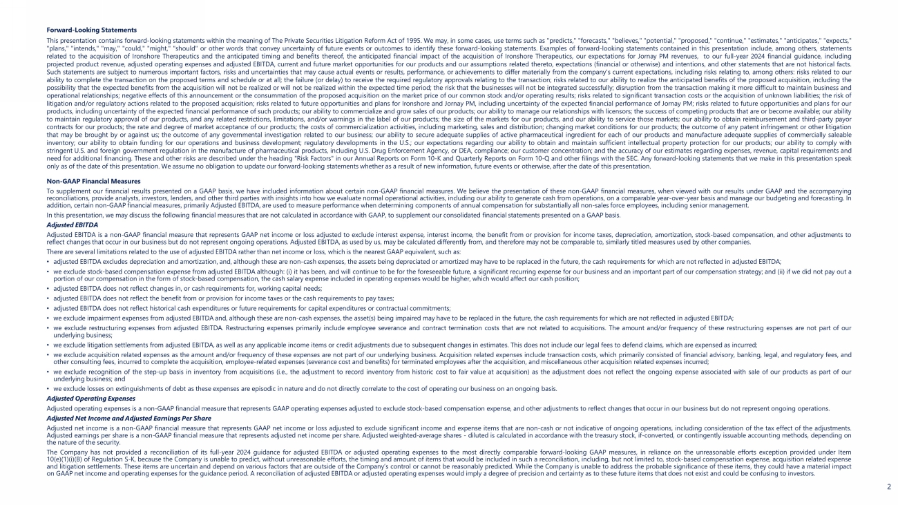 Forward - Looking Statements This presentation contains forward - looking statements within the meaning of The Private Securities Litigation Reform Act of 1995 . We may, in some cases, use terms such as "predicts," "forecasts," "believes," "potential," "proposed," "continue," "estimates," "anticipates," "expects," "plans," "intends," "may," "could," "might," "should" or other words that convey uncertainty of future events or outcomes to identify these forward - looking statements . Examples of forward - looking statements contained in this presentation include, among others, statements related to the acquisition of Ironshore Therapeutics and the anticipated timing and benefits thereof, the anticipated financial impact of the acquisition of Ironshore Therapeutics, our expectations for Jornay PM revenues, to our full - year 2024 financial guidance, including projected product revenue, adjusted operating expenses and adjusted EBITDA, current and future market opportunities for our products and our assumptions related thereto, expectations (financial or otherwise) and intentions, and other statements that are not historical facts . Such statements are subject to numerous important factors, risks and uncertainties that may cause actual events or results, performance, or achievements to differ materially from the company's current expectations, including risks relating to, among others : risks related to our ability to complete the transaction on the proposed terms and schedule or at all ; the failure (or delay) to receive the required regulatory approvals relating to the transaction ; risks related to our ability to realize the anticipated benefits of the proposed acquisition, including the possibility that the expected benefits from the acquisition will not be realized or will not be realized within the expected time period ; the risk that the businesses will not be integrated successfully ; disruption from the transaction making it more difficult to maintain business and operational relationships ; negative effects of this announcement or the consummation of the proposed acquisition on the market price of our common stock and/or operating results ; risks related to significant transaction costs or the acquisition of unknown liabilities ; the risk of litigation and/or regulatory actions related to the proposed acquisition ; risks related to future opportunities and plans for Ironshore and Jornay PM, including uncertainty of the expected financial performance of Jornay PM ; risks related to future opportunities and plans for our products, including uncertainty of the expected financial performance of such products ; our ability to commercialize and grow sales of our products ; our ability to manage our relationships with licensors ; the success of competing products that are or become available ; our ability to maintain regulatory approval of our products, and any related restrictions, limitations, and/or warnings in the label of our products ; the size of the markets for our products, and our ability to service those markets ; our ability to obtain reimbursement and third - party payor contracts for our products ; the rate and degree of market acceptance of our products ; the costs of commercialization activities, including marketing, sales and distribution ; changing market conditions for our products ; the outcome of any patent infringement or other litigation that may be brought by or against us ; the outcome of any governmental investigation related to our business ; our ability to secure adequate supplies of active pharmaceutical ingredient for each of our products and manufacture adequate supplies of commercially saleable inventory ; our ability to obtain funding for our operations and business development ; regulatory developments in the U . S .; our expectations regarding our ability to obtain and maintain sufficient intellectual property protection for our products ; our ability to comply with stringent U . S . and foreign government regulation in the manufacture of pharmaceutical products, including U . S . Drug Enforcement Agency, or DEA, compliance ; our customer concentration ; and the accuracy of our estimates regarding expenses, revenue, capital requirements and need for additional financing . These and other risks are described under the heading "Risk Factors" in our Annual Reports on Form 10 - K and Quarterly Reports on Form 10 - Q and other filings with the SEC . Any forward - looking statements that we make in this presentation speak only as of the date of this presentation . We assume no obligation to update our forward - looking statements whether as a result of new information, future events or otherwise, after the date of this presentation . Non - GAAP Financial Measures To supplement our financial results presented on a GAAP basis, we have included information about certain non - GAAP financial measures . We believe the presentation of these non - GAAP financial measures, when viewed with our results under GAAP and the accompanying reconciliations, provide analysts, investors, lenders, and other third parties with insights into how we evaluate normal operational activities, including our ability to generate cash from operations, on a comparable year - over - year basis and manage our budgeting and forecasting . In addition, certain non - GAAP financial measures, primarily Adjusted EBITDA, are used to measure performance when determining components of annual compensation for substantially all non - sales force employees, including senior management . In this presentation, we may discuss the following financial measures that are not calculated in accordance with GAAP, to supplement our consolidated financial statements presented on a GAAP basis . Adjusted EBITDA Adjusted EBITDA is a non - GAAP financial measure that represents GAAP net income or loss adjusted to exclude interest expense, interest income, the benefit from or provision for income taxes, depreciation, amor