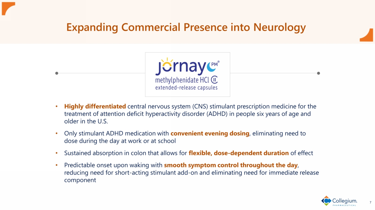 Ironshore Acquisition Aligns with All Strategic Objectives x Differentiated, commercial - stage assets to diversify specialty pharmaceutical portfolio Addition of Jornay PM ® establishes a commercial presence in neurology (ADHD) with a highly differentiated product, diversifying portfolio x Significant revenue and growth potential Jornay PM net revenue expected to be >$100M in 2024 with potential to become the leading growth driver for Collegium x Durable with exclusivity into 2030s 16 Orange Book - listed patents, with expiries in 2032 Expected to be immediately accretive to adjusted EBITDA at closing 5 Collegium to leverage core competencies: commercial execution and track record of efficiently and successfully integrating commercial acquisitions to maximize potential of Jornay PM