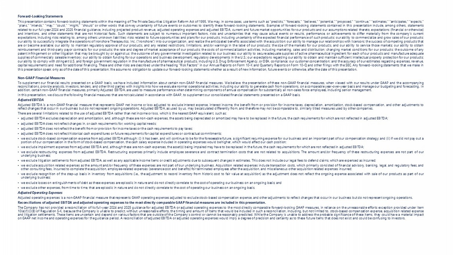 Forward - Looking Statements This presentation contains forward - looking statements within the meaning of The Private Securities Litigation Reform Act of 1995 . We may, in some cases, use terms such as "predicts," "forecasts," "believes," "potential," "proposed," "continue," "estimates," "anticipates," "expects," "plans," "intends," "may," "could," "might," "should" or other words that convey uncertainty of future events or outcomes to identify these forward - looking statements . Examples of forward - looking statements contained in this presentation include, among others, statements related to our full - year 2024 and 2025 financial guidance, including projected product revenue, adjusted operating expenses and adjusted EBITDA, current and future market opportunities for our products and our assumptions related thereto, expectations (financial or otherwise) and intentions, and other statements that are not historical facts . Such statements are subject to numerous important factors, risks and uncertainties that may cause actual events or results, performance, or achievements to differ materially from the company's current expectations, including risks relating to, among others : unknown liabilities ; risks related to future opportunities and plans for our products, including uncertainty of the expected financial performance of such products ; our ability to commercialize and grow sales of our products ; our ability to successfully integrate the operations of Ironshore Therapeutics, Inc . (“Ironshore”) into our organization, and realize the anticipated benefits associated with the acquisition ; our ability to manage our relationships with licensors ; the success of competing products that are or become available ; our ability to maintain regulatory approval of our products, and any related restrictions, limitations, and/or warnings in the label of our products ; the size of the markets for our products, and our ability to service those markets ; our ability to obtain reimbursement and third - party payor contracts for our products ; the rate and degree of market acceptance of our products ; the costs of commercialization activities, including marketing, sales and distribution ; changing market conditions for our products ; the outcome of any patent infringement or other litigation that may be brought by or against us ; the outcome of any governmental investigation related to our business ; our ability to secure adequate supplies of active pharmaceutical ingredient for each of our products and manufacture adequate supplies of commercially saleable inventory ; our ability to obtain funding for our operations and business development ; regulatory developments in the U . S .; our expectations regarding our ability to obtain and maintain sufficient intellectual property protection for our products ; our ability to comply with stringent U . S . and foreign government regulation in the manufacture of pharmaceutical products, including U . S . Drug Enforcement Agency, or DEA, compliance ; our customer concentration ; and the accuracy of our estimates regarding expenses, revenue, capital requirements and need for additional financing . These and other risks are described under the heading "Risk Factors" in our Annual Reports on Form 10 - K and Quarterly Reports on Form 10 - Q and other filings with the SEC . Any forward - looking statements that we make in this presentation speak only as of the date of this presentation . We assume no obligation to update our forward - looking statements whether as a result of new information, future events or otherwise, after the date of this presentation . Non - GAAP Financial Measures To supplement our financial results presented on a GAAP basis, we have included information about certain non - GAAP financial measures . We believe the presentation of these non - GAAP financial measures, when viewed with our results under GAAP and the accompanying reconciliations, provide analysts, investors, lenders, and other third parties with insights into how we evaluate normal operational activities, including our ability to generate cash from operations, on a comparable year - over - year basis and manage our budgeting and forecasting . In addition, certain non - GAAP financial measures, primarily Adjusted EBITDA, are used to measure performance when determining components of annual compensation for substantially all non - sales force employees, including senior management . In this presentation, we discuss the following financial measures that are not calculated in accordance with GAAP, to supplement our consolidated financial statements presented on a GAAP basis . Adjusted EBITDA Adjusted EBITDA is a non - GAAP financial measure that represents GAAP net income or loss adjusted to exclude interest expense, interest income, the benefit from or provision for income taxes, depreciation, amortization, stock - based compensation, and other adjustments to reflect changes that occur in our business but do not represent ongoing operations . Adjusted EBITDA, as used by us, may be calculated differently from, and therefore may not be comparable to, similarly titled measures used by other companies . There are several limitations related to the use of adjusted EBITDA rather than net income or loss, which is the nearest GAAP equivalent, such as : • adjusted EBITDA excludes depreciation and amortization, and, although these are non - cash expenses, the assets being depreciated or amortized may have to be replaced in the future, the cash requirements for which are not reflected in adjusted EBITDA ; • adjusted EBITDA does not reflect changes in, or cash requirements for, working capital needs ; • adjusted EBITDA does not reflect the benefit from or provision for income taxes or the cash requirements to pay taxes ; • adjusted EBITDA does not reflect historical cash expenditures or future requirements for capital expenditures or contractual commitments ; • we exclude stoc
