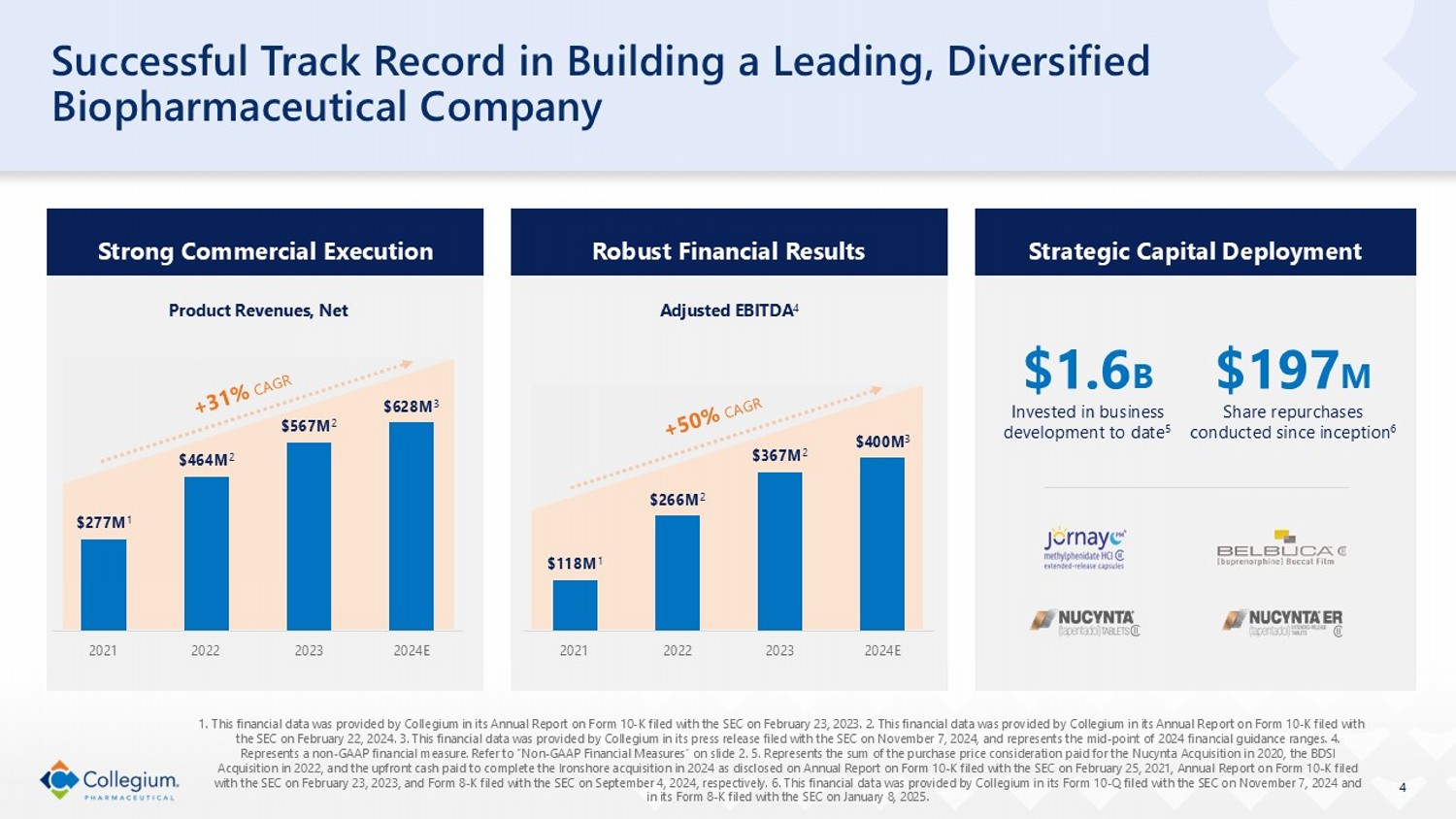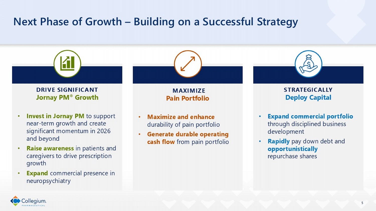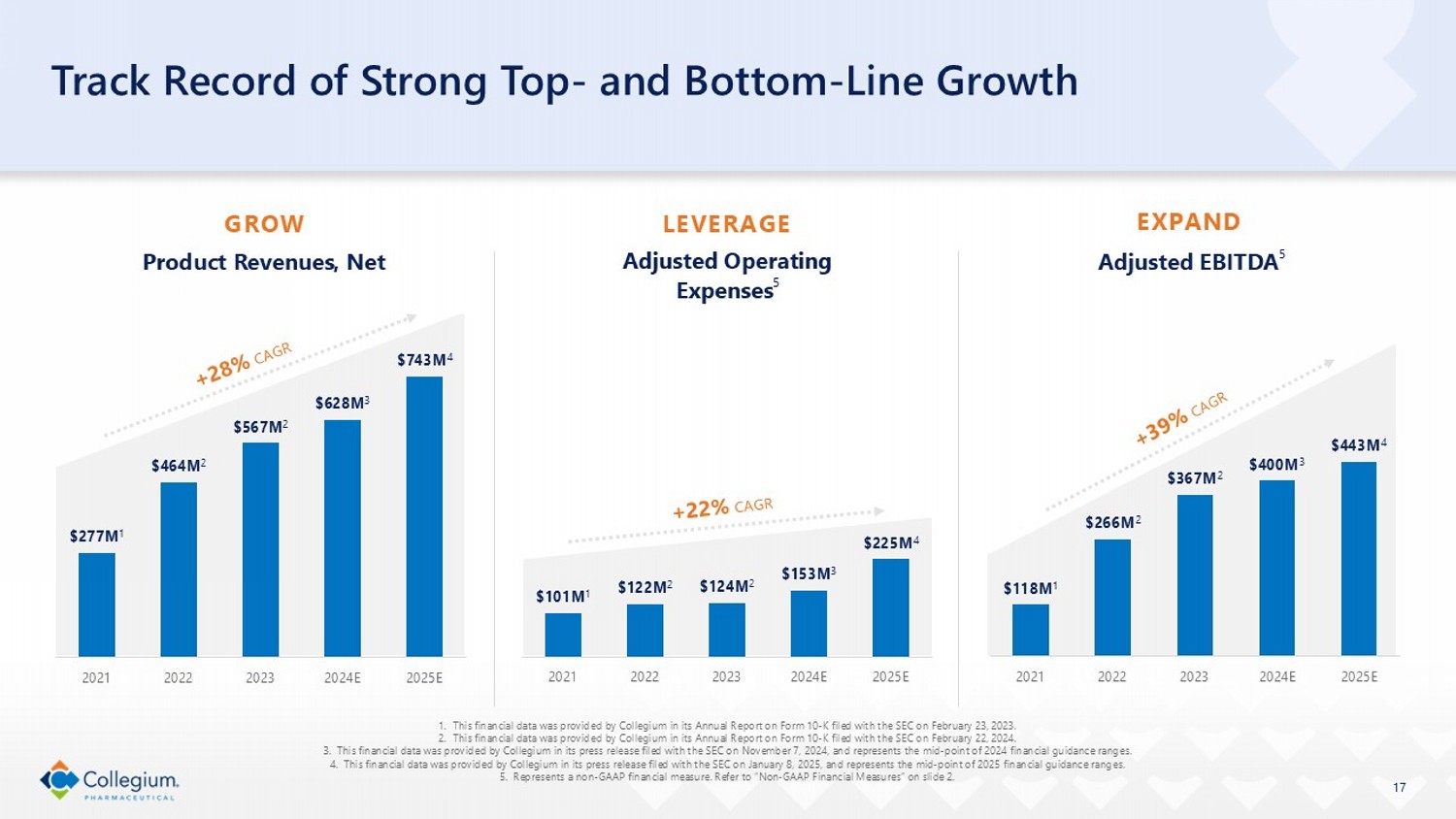 4 Successful Track Record in Building a Leading, Diversified Biopharmaceutical Company Strong Commercial Execution Strategic Capital Deployment Robust Financial Results Adjusted EBITDA 4 $197 M Share repurchases conducted since inception 6 $1.6 B Invested in business development to date 5 Product Revenues, Net $277M 1 $464M 2 $567M 2 $628M 3 2021 2022 2023 2024E $118M 1 $266M 2 $367M 2 $400M 3 2021 2022 2023 2024E 1. This financial data was provided by Collegium in its Annual Report on Form 10 - K filed with the SEC on February 23, 2023. 2. This financial data was provided by Collegium in its Annual Report on Form 10 - K filed with the SEC on February 22, 2024. 3. This financial data was provided by Collegium in its press release filed with the SEC on November 7, 2024, and represents the mid - point of 2024 financial guidance ranges. 4. Represents a non - GAAP financial measure. Refer to “Non - GAAP Financial Measures” on slide 2. 5. Represents the sum of the purchase price consideration paid for the Nucynt a Acquisition in 2020, the BDSI Acquisition in 2022, and the upfront cash paid to complete the Ironshore acquisition in 2024 as disclosed on Annual Report on Fo rm 10 - K filed with the SEC on February 25, 2021, Annual Report on Form 10 - K filed with the SEC on February 23, 2023, and Form 8 - K filed with the SEC on September 4, 2024, respectively. 6. This financial data wa s provided by Collegium in its Form 10 - Q filed with the SEC on November 7, 2024 and in its Form 8 - K filed with the SEC on January 8, 2025.