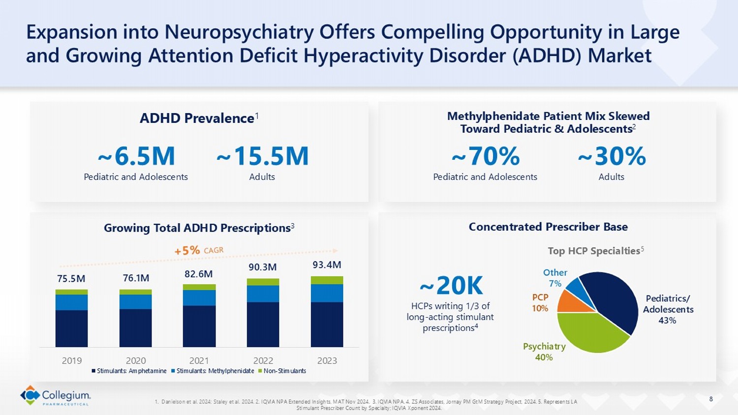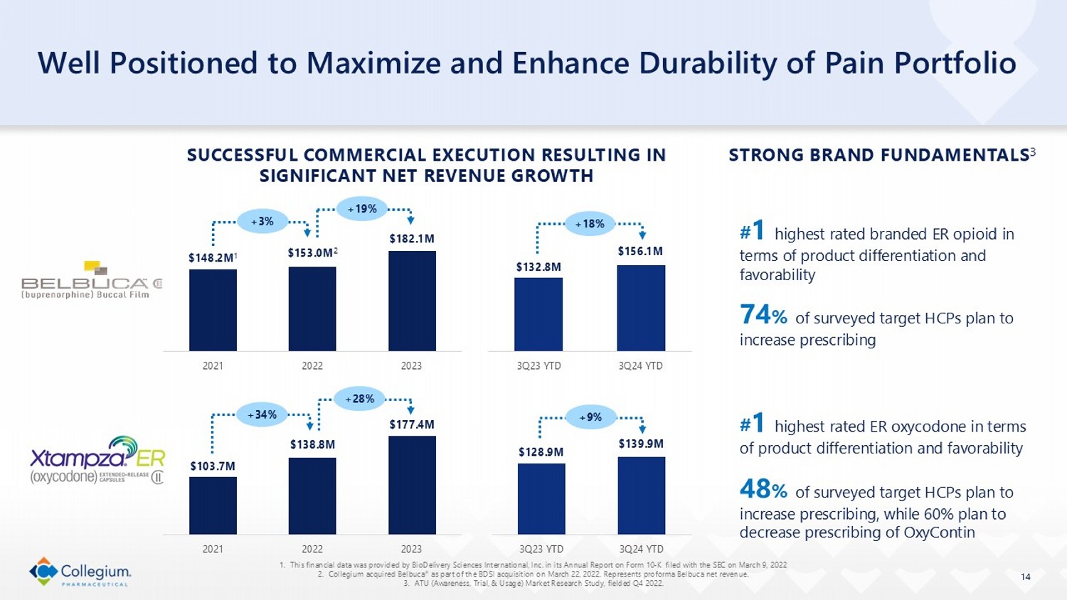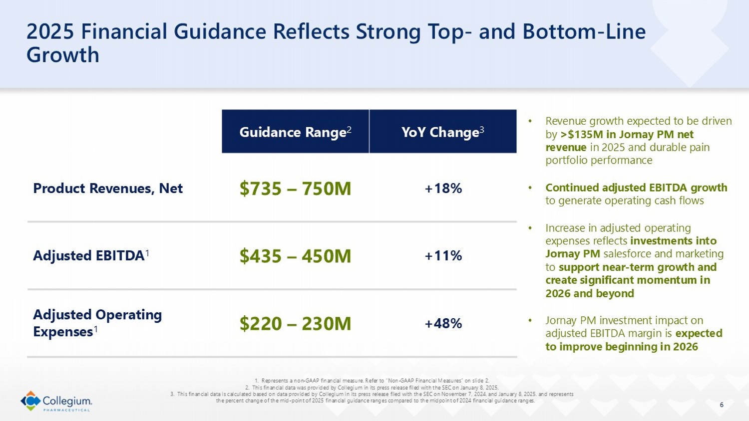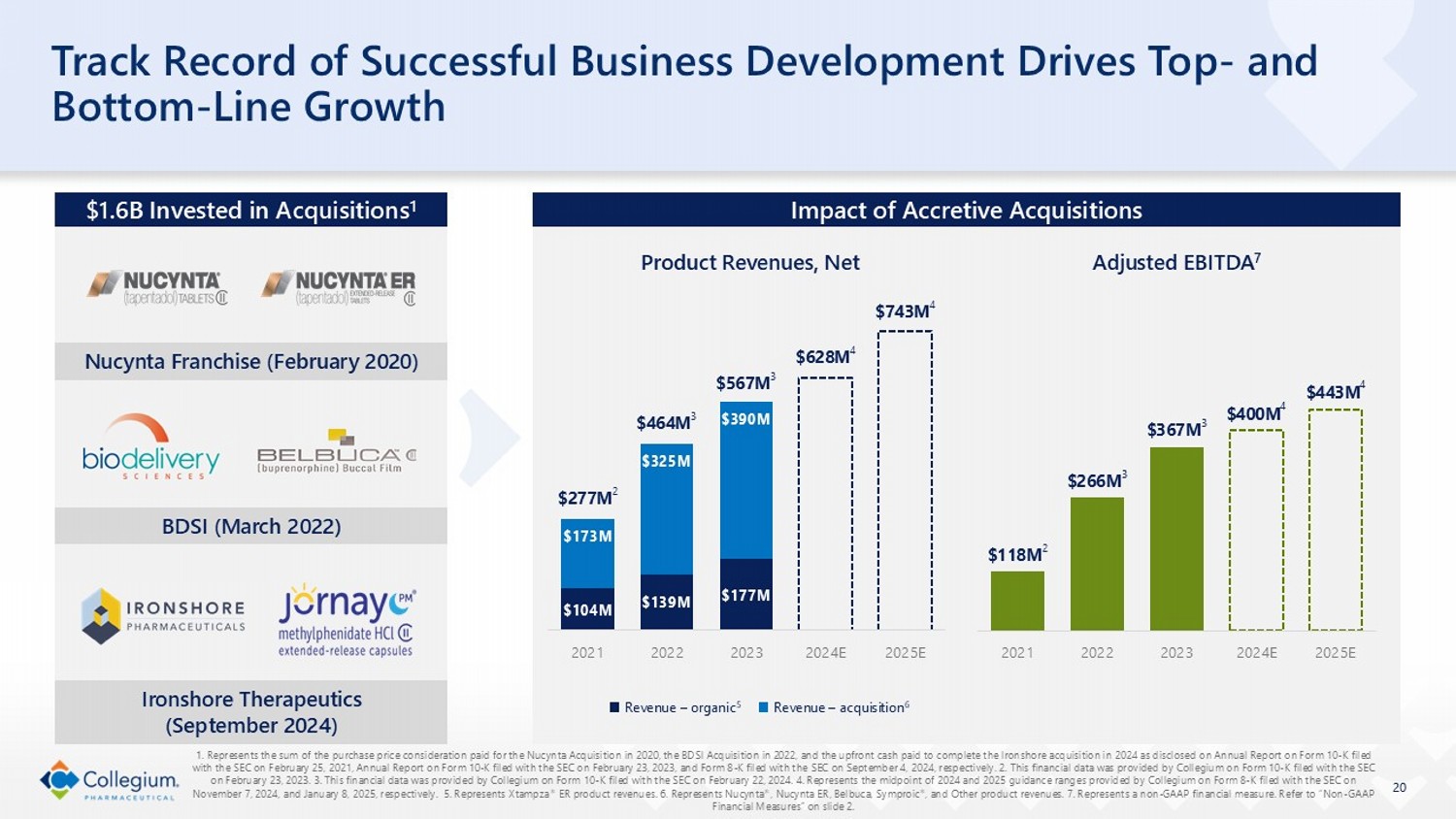 4 Successful Track Record in Building a Leading, Diversified Biopharmaceutical Company Strong Commercial Execution Strategic Capital Deployment Robust Financial Results Adjusted EBITDA 4 $197 M Share repurchases conducted since inception 6 $1.6 B Invested in business development to date 5 Product Revenues, Net $277M 1 $464M 2 $567M 2 $628M 3 2021 2022 2023 2024E $118M 1 $266M 2 $367M 2 $400M 3 2021 2022 2023 2024E 1. This financial data was provided by Collegium in its Annual Report on Form 10 - K filed with the SEC on February 23, 2023. 2. This financial data was provided by Collegium in its Annual Report on Form 10 - K filed with the SEC on February 22, 2024. 3. This financial data was provided by Collegium in its press release filed with the SEC on November 7, 2024, and represents the mid - point of 2024 financial guidance ranges. 4. Represents a non - GAAP financial measure. Refer to “Non - GAAP Financial Measures” on slide 2. 5. Represents the sum of the purchase price consideration paid for the Nucynt a Acquisition in 2020, the BDSI Acquisition in 2022, and the upfront cash paid to complete the Ironshore acquisition in 2024 as disclosed on Annual Report on Fo rm 10 - K filed with the SEC on February 25, 2021, Annual Report on Form 10 - K filed with the SEC on February 23, 2023, and Form 8 - K filed with the SEC on September 4, 2024, respectively. 6. This financial data wa s provided by Collegium in its Form 10 - Q filed with the SEC on November 7, 2024 and in its Form 8 - K filed with the SEC on January 8, 2025.