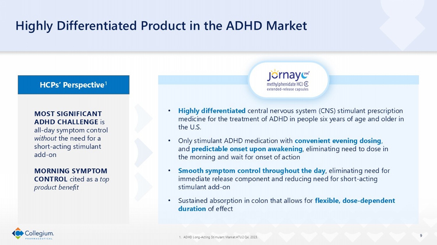 8 Expansion into Neuropsychiatry Offers Compelling Opportunity in Large and Growing Attention Deficit Hyperactivity Disorder (ADHD) Market Growing Total ADHD Prescriptions 3 ADHD Prevalence 1 ~6.5M Pediatric and Adolescents ~15.5M Adults ~20K HCPs writing 1/3 of long - acting stimulant prescriptions 4 Methylphenidate Patient Mix Skewed Toward Pediatric & Adolescents 2 Pediatrics/ Adolescents 43% Psychiatry 40% PCP 10% Other 7% Top HCP Specialties 5 2019 2020 2021 2022 2023 Stimulants: Amphetamine Stimulants: Methylphenidate Non-Stimulants 1. Danielson et al. 2024; Staley et al. 2024. 2. IQVIA NPA Extended Insights, MAT Nov 2024. 3. IQVIA NPA. 4. ZS Associates, Jornay PM GtM Strategy Project, 2024. 5. Represents LA Stimulant Prescriber Count by Specialty; IQVIA Xponent 2024. 75.5M 76.1M 82.6M 90.3M 93.4M ~70% Pediatric and Adolescents ~30% Adults Concentrated Prescriber Base